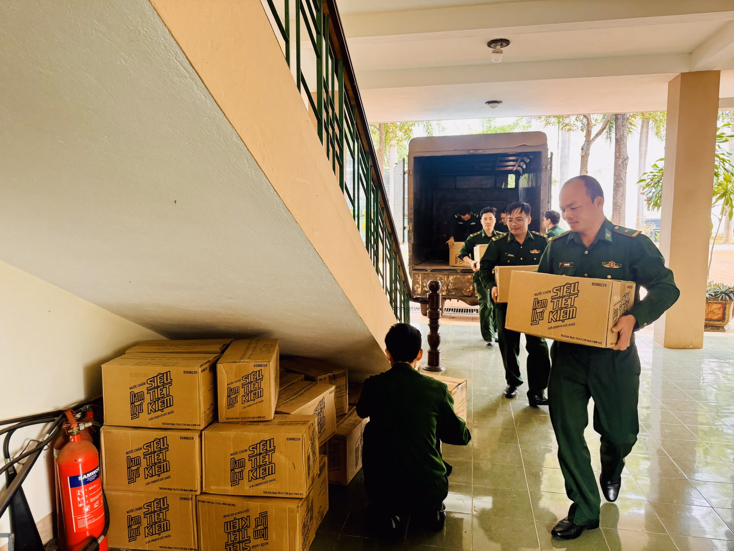 1.000 chai nước mắm của Công ty Cổ phần Tập đoàn Masan – nhãn hiệu nước mắm Nam Ngư đã được tập kết về Ban Chỉ huy Bộ đội Biên phòng Đắk Lắk. Ảnh: Thanh Nga.