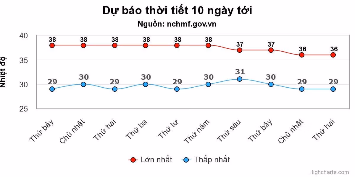 Biểu đồ dự báo nhiệt độ cho thấy Hà Nội đạt đỉnh 38 độ C liên tục trong 7 ngày tới. Đến khoảng ngày 7/7, nhiệt độ mới giảm nhẹ nhưng vẫn duy trì ngưỡng nắng nóng trên 35 độ C.