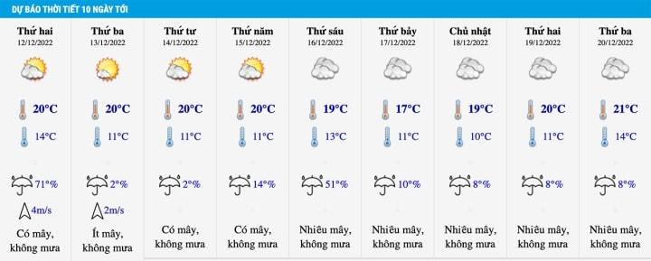 Tại Hà Nội, từ 13-15/12, nhiệt độ phổ biển 11-20 độ C. Các ngày 18-19/12, nhiệt độ ở Hà Nội giảm, thấp nhất ghi nhận mức 10 độ C.