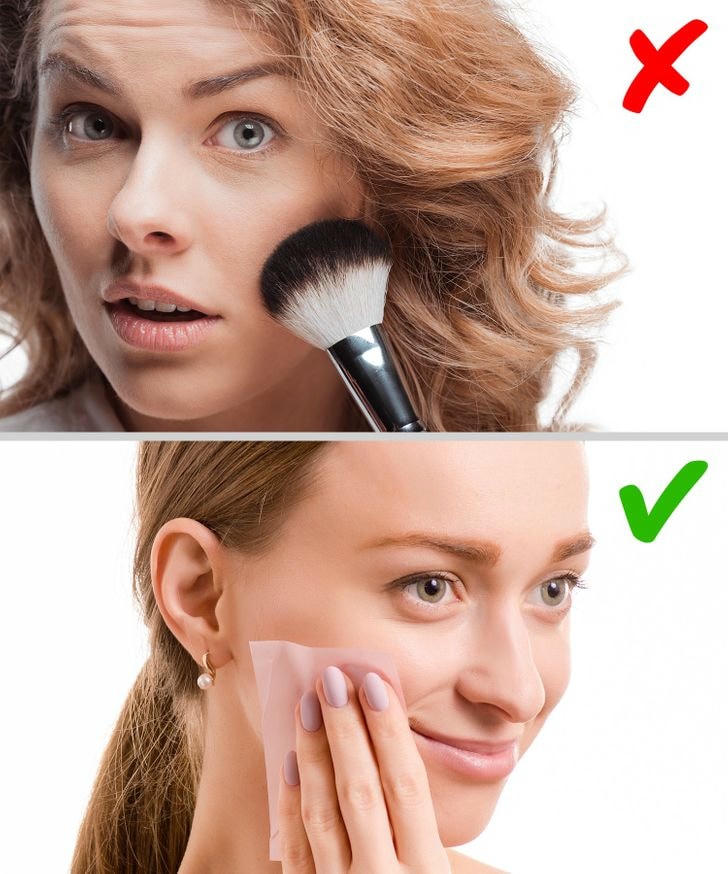 Đầu tiên, cần phải loại bỏ hết chất nhờn trên mặt bằng giấy thấm dầu chuyên dụng, sau đó đánh phấn phủ. Nếu không rửa mặt sạch trước khi phủ phấn, tất cả bụi bẩn và dầu nhờn sẽ đọng lại dưới lớp trang điểm mới. Điều này không có lợi cho da của bạn và có thể gây ra tắc nghẽn lỗ chân lông, nổi mụn và kích ứng.