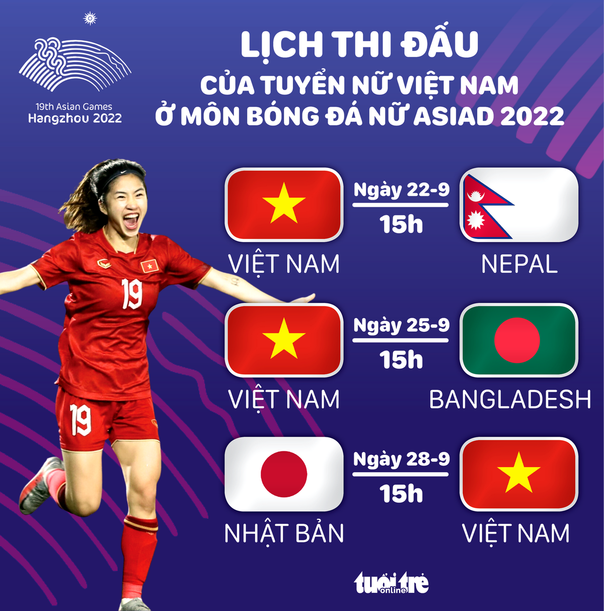 Theo kế hoạch, Đội tuyển Nữ Việt Nam sẽ có trận đấu đầu tiên tại ASIAD 2023 gặp Tuyển Nữ Nepal vào lúc 15h ngày 22/9 (giờ Việt Nam) tại Sân vận động Olympic Ôn Châu, Trung Quốc.
