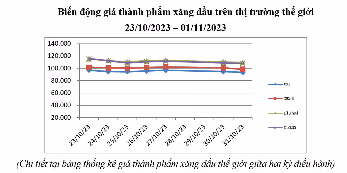 Theo thông tin từ Bộ Công Thương, thị trường xăng dầu thế giới kỳ điều hành lần này (từ ngày 23/10/2023 - 1/11/2023) chịu ảnh hưởng của các yếu tố như: Khả năng gián đoạn nguồn cung từ cuộc xung đột ở Trung Đông không cao và việc tăng sản lượng từ Mỹ và OPEC khiến giá xăng dầu từ ngày 23/10 đến 1/11 có biến động tăng giảm đan xen.