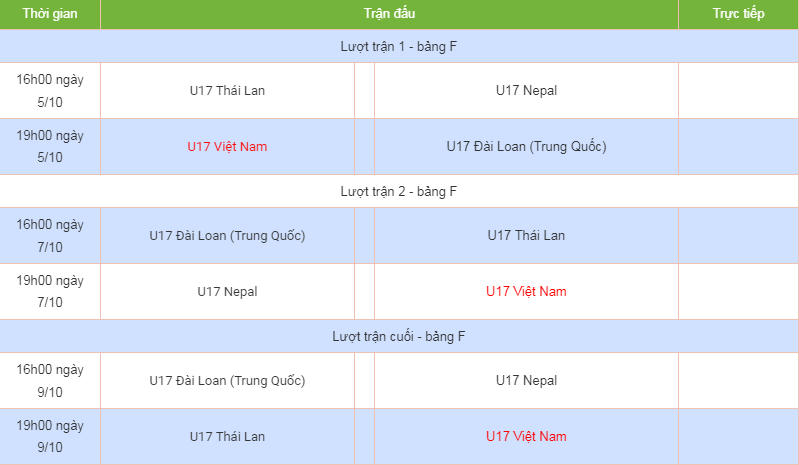 19h ngày 5/10, U17 Việt Nam gặp U17 Đài Loan (Trung Quốc)