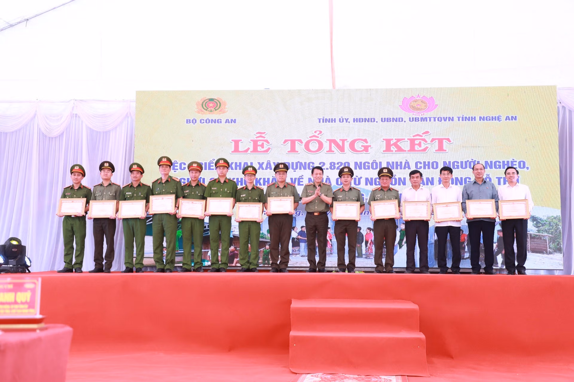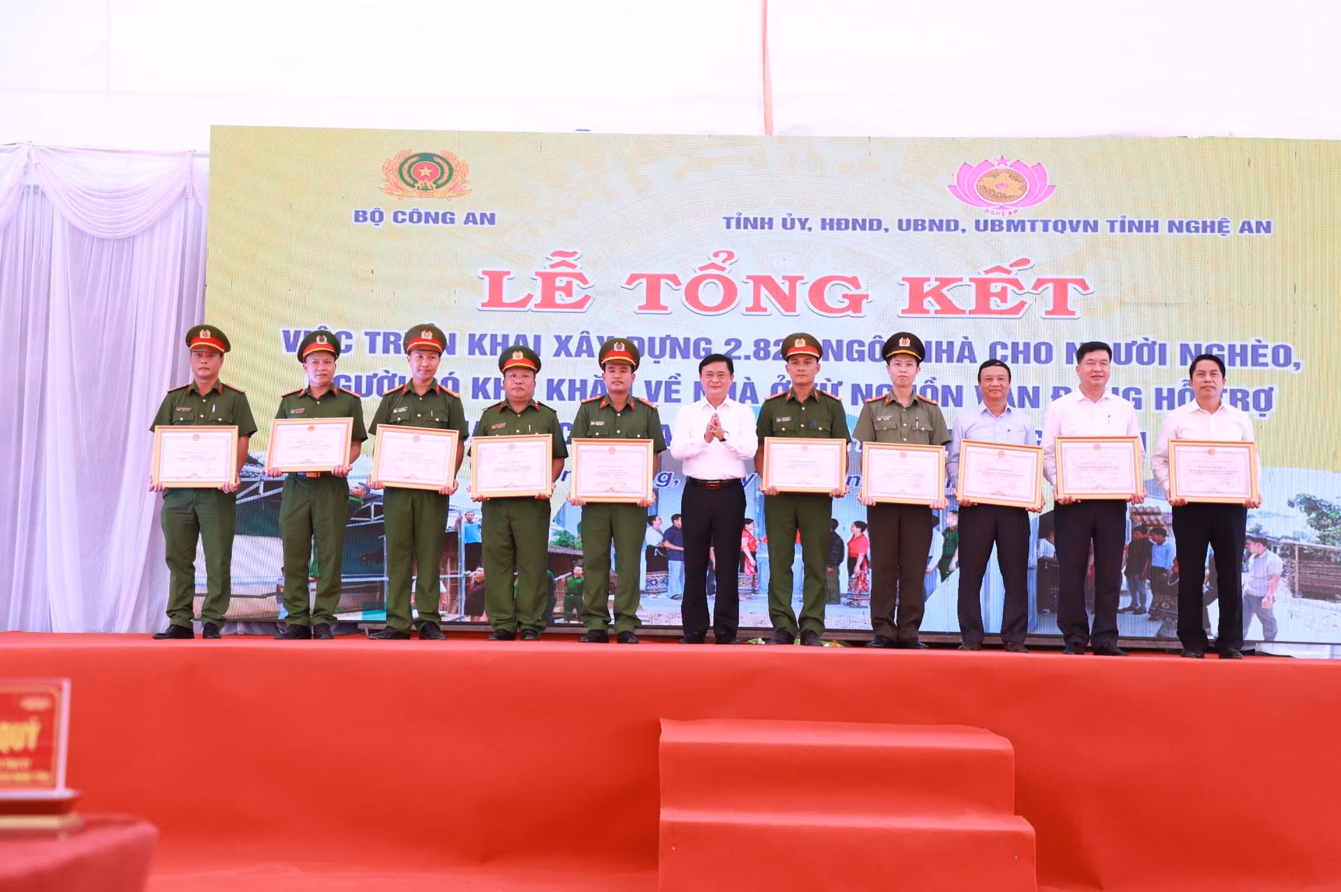 Tại chương trình, lãnh đạo Bộ Công an và tỉnh Nghệ An cũng đã khen thưởng các tập thể, cá nhân có thành tích xuất sắc trong công tác xây dựng 2.820 ngôi nhà trên địa bàn tỉnh Nghệ An và trao quà cho các hộ gia đình có hoàn cảnh khó khăn tại huyện Con Cuông.