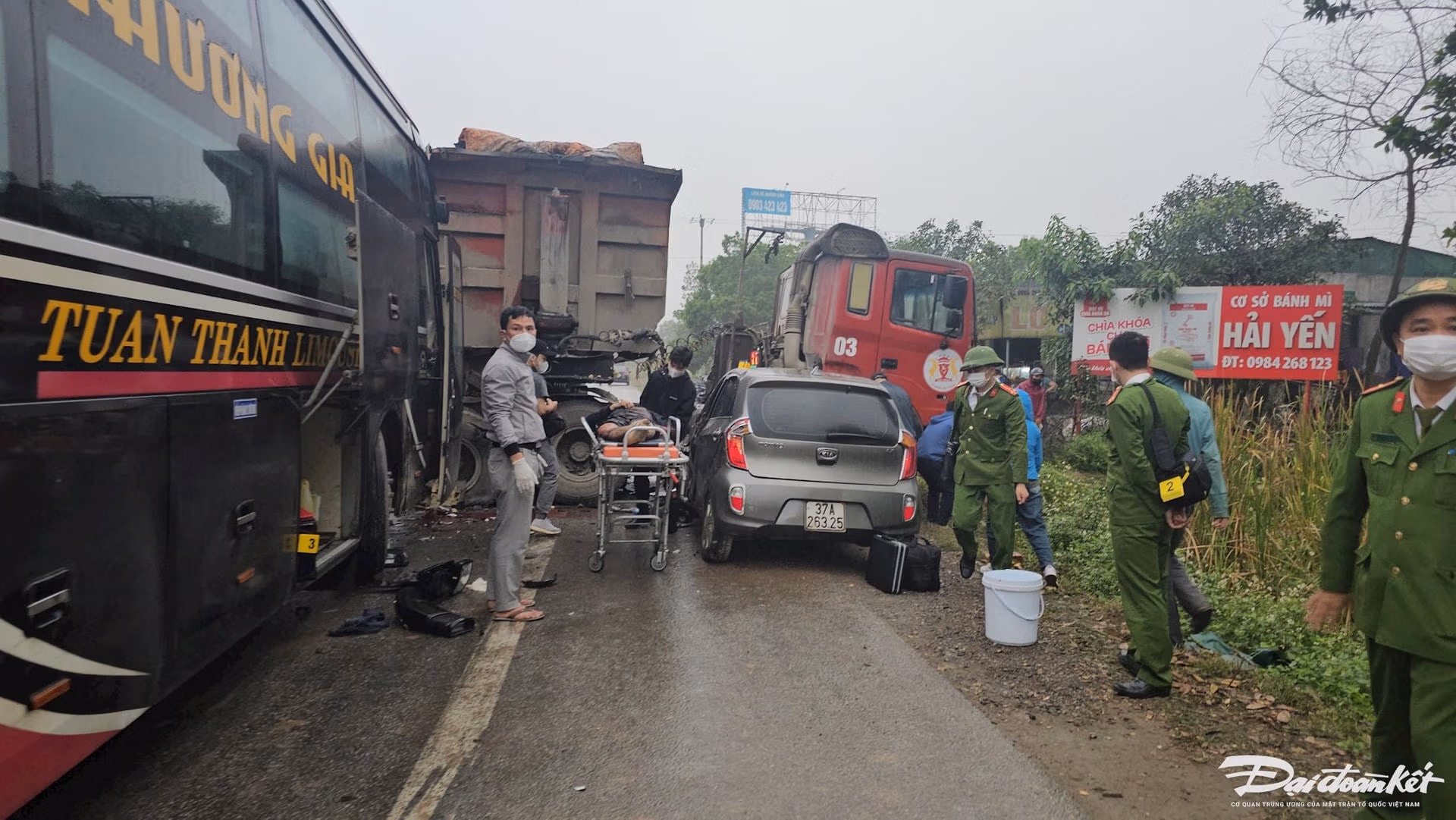 Lúc này, chiếc xe khách mang tên Tuấn Thành do bất ngờ, không xử lý kịp đã đâm vào đuôi xe đầu kéo. Cú va chạm mạnh khiến xe ôtô con bẹp dúm đầu, tài xế ô tô con tử vong tại chỗ, người còn lại bị thương nặng.