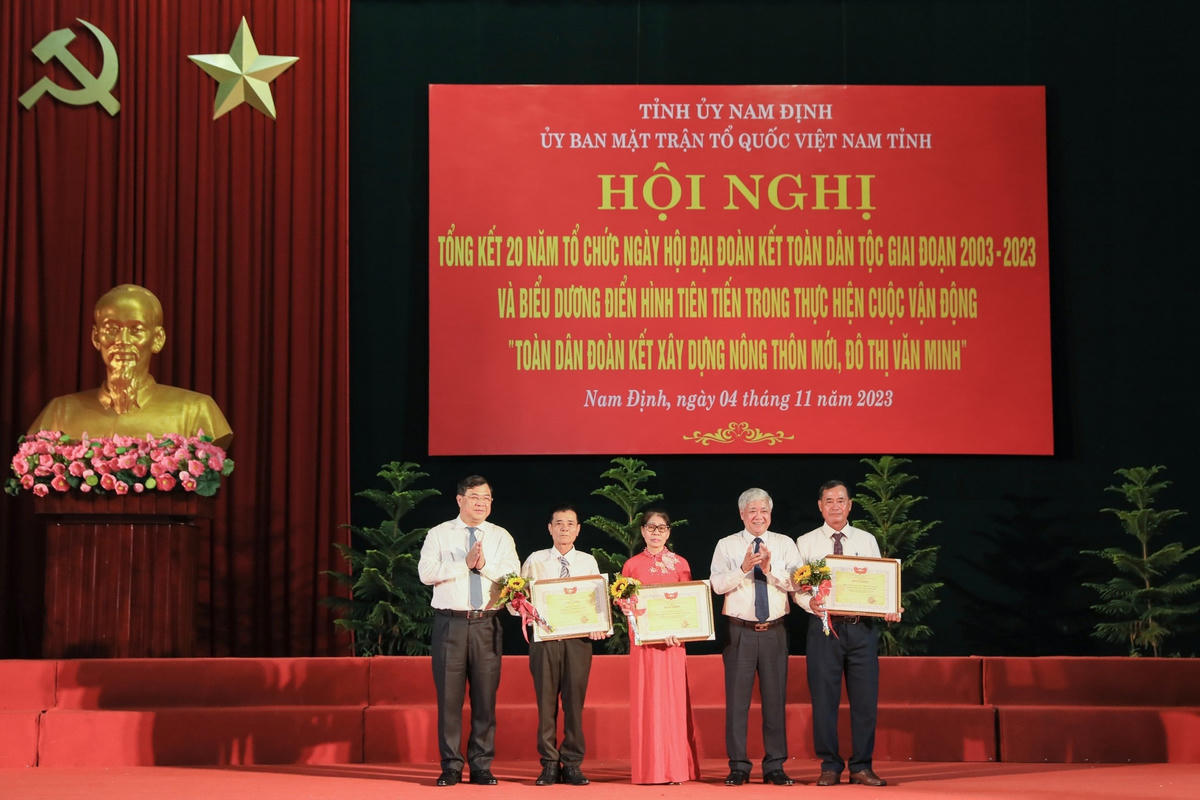 Nhân dịp tổng kết 20 năm Ngày hội Đại đoàn kết toàn dân tộc, tỉnh Nam Định đã biểu dương, khen thưởng các điển hình trong thực hiện CVĐ “Toàn dân đoàn kết xây dựng Nông thôn mới, đô thị văn minh”.