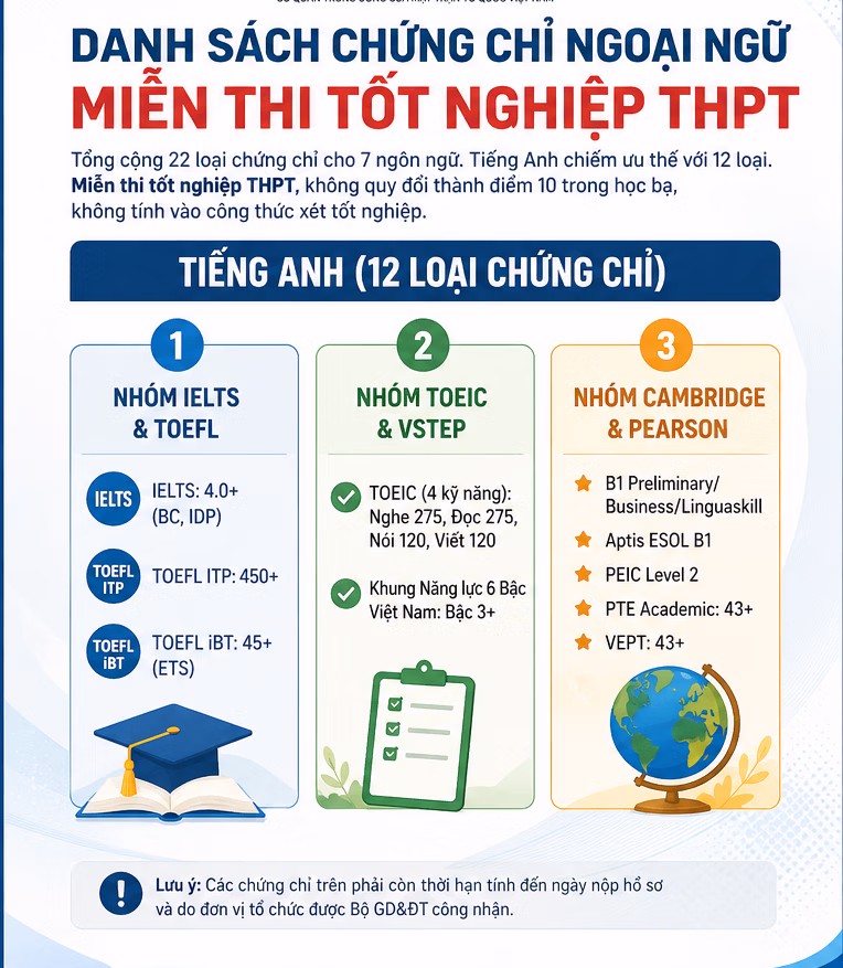 22 chứng chỉ được miễn thi Ngoại ngữ tốt nghiệp THPT 2026