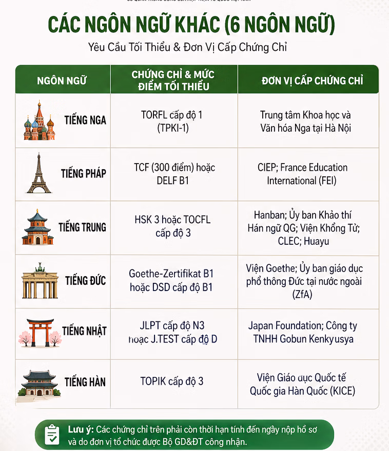 Bên cạnh đó, thí sinh cần kiểm tra kỹ loại chứng chỉ, mức điểm và thời hạn hiệu lực theo danh mục được chấp nhận. Việc khai báo sai hoặc sử dụng chứng chỉ không còn giá trị có thể ảnh hưởng trực tiếp đến quyền lợi xét tốt nghiệp.