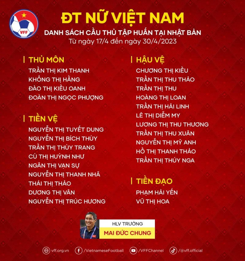 Chuyến tập huấn tại Nhật Bản của ĐT nữ Việt Nam sẽ kéo dài trong 2 tuần, từ 17/4 đến 30/4. Tại đây, thày trò HLV Mai Đức Chung sẽ có 3 trận đấu giao hữu với các câu lạc bộ: ĐH TDTT Biwako Seikei (ngày 19/4), Cerezo Osaka (ngày 22/4), ĐH TDTT Osaka (ngày 26/4). Đây sẽ là những bài kiểm tra quan trọng để ban huấn luyện đánh giá, phân tích trước khi đưa ra danh sách rút gọn tham dự SEA Games 32 gồm Huỳnh Như và 19 cầu thủ tham gia tập huấn lần này.