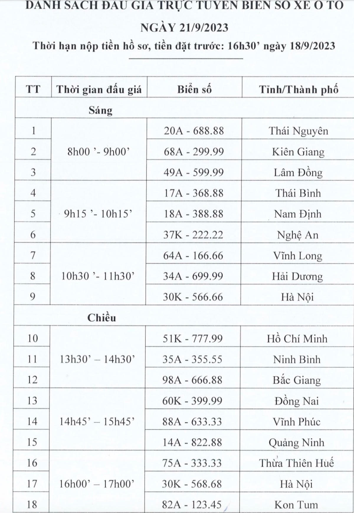 Buổi chiều 21/9, 9 biển số được đưa ra đấu giá gồm: 51K-777.99, 35A-355.55, 98A-666.88 (khung giờ từ 13h30 đến 14h30); 60K-399.99, 88A-633.33, 14A-822.88 (khung giờ từ 14h45 đến 15h45); 75A-333.33, 30K-568.68, 82A-123.45 (khung giờ từ 16h đến 17h).