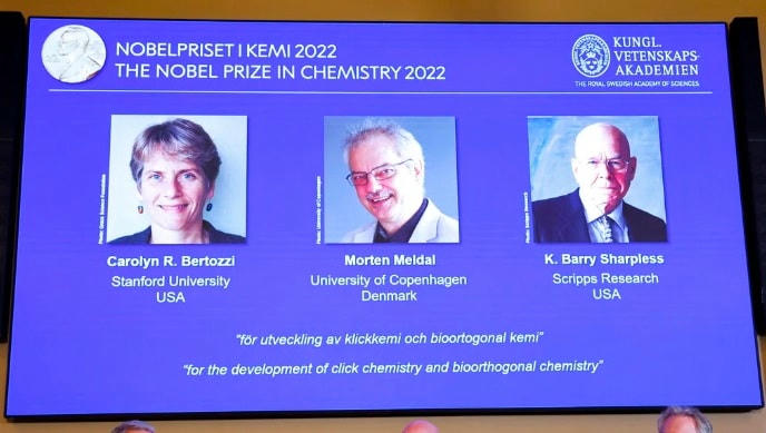 Giải Nobel Hóa học được trao cho 3 nhà khoa học Carolyn R. Bertozzi, Morten Meldal và K. Barry Sharpless nhờ "công cụ thiên tài" gắn kết phân tử, qua đó mang lại lợi ích to lớn trong y học và dược phẩm, trong đó có điều trị ung thư trúng đích.