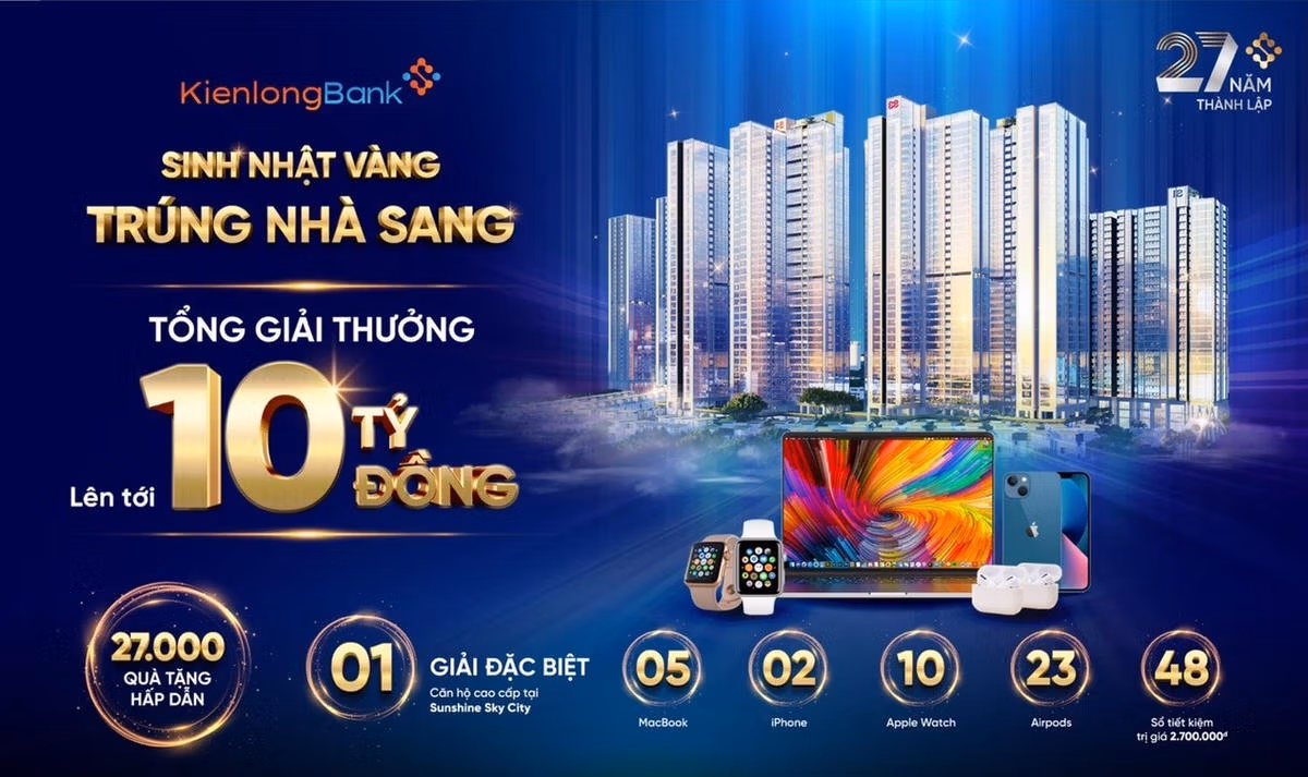 Mừng sinh nhật 27 năm hình thành và phát triển của Ngân hàng Kiên Long, khách hàng gửi tiết kiệm từ 200 triệu đồng với kỳ hạn từ 6 tháng trở lên sẽ có cơ hội tham gia chương trình quay số trúng thưởng. Khách hàng may mắn sẽ có cơ hội giành giải Đặc biệt là một căn hộ chung cư cao cấp Sunshine Sky City trong thời gian diễn ra chương trình “Sinh nhật Vàng - Trúng nhà Sang”.