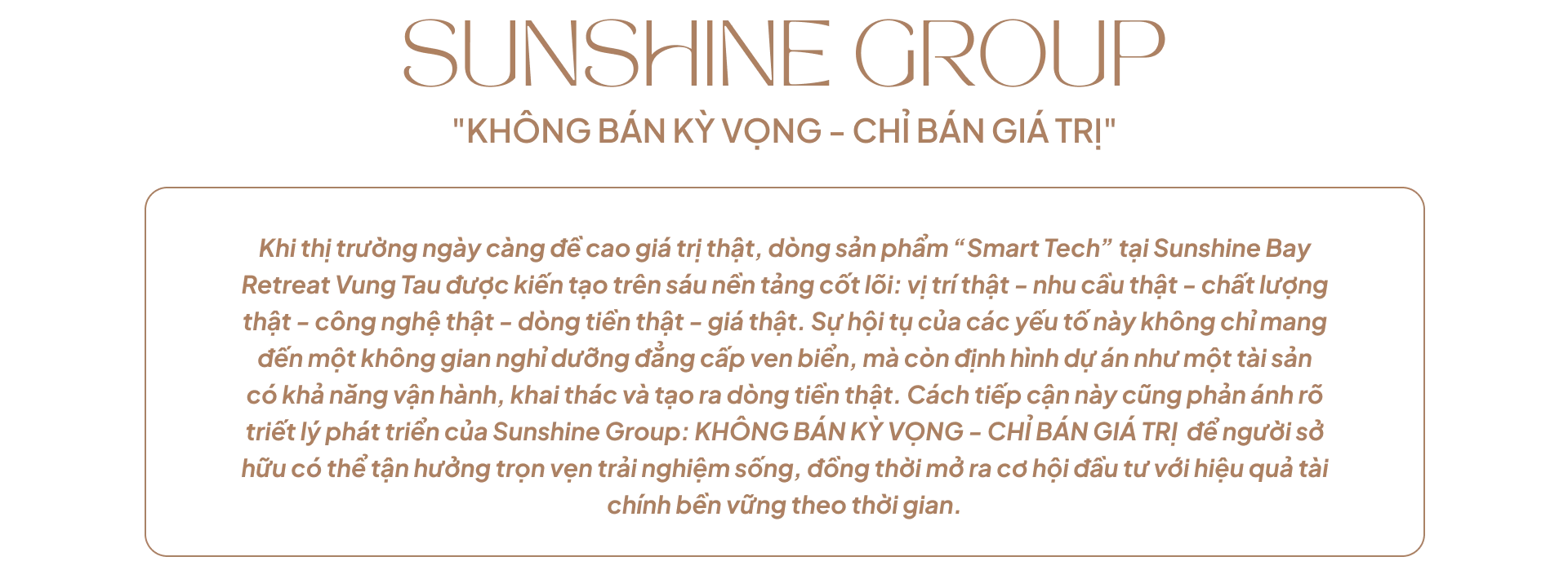Có thể nói, Sunshine Bay Retreat Vung Tau đang sở hữu một công thức đầu tư hấp dẫn bậc nhất thị trường hiện nay: giá hợp lý, vốn đầu tư thấp, thanh khoản cao và khả năng khai thác tức thì. Đây chính là nền tảng vững chắc để sản phẩm không chỉ dừng lại ở sự dễ dàng tiếp cận, mà còn sở hữu dư địa tăng trưởng mạnh mẽ khi đón đúng chu kỳ bùng nổ của hạ tầng khu vực.
