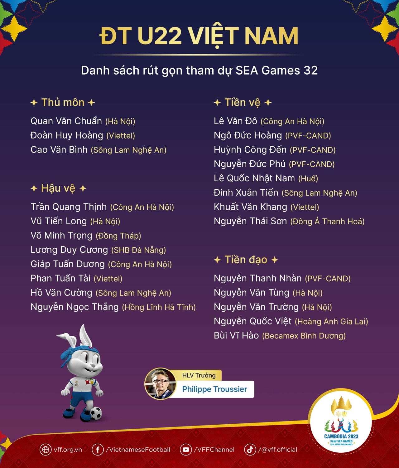 Thầy trò HLV Philippe Troussier lên đường sang Campuchia vào ngày 26/4, có 4 ngày chuẩn bị cho trận ra quân gặp Lào, tại bảng B bóng đá nam SEA Games 32. Một ngày trước trận đấu, HLV Philippe Troussier chính thức chốt danh sách 20 cầu thủ U22 Việt Nam.