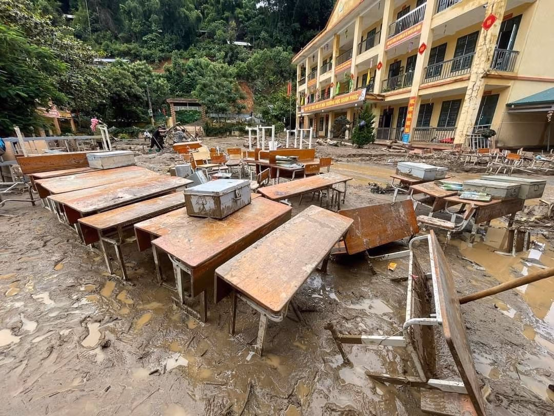 Những ngày qua, trận lũ quét lịch sử đã gây ra nhiều thiệt hại về người và của tại huyện Mù Cang Chải, tỉnh Yên Bái. Nằm trong vùng “tâm lũ”, Trường Phổ thông dân tộc bán trú (PTDTBT) TH và THCS Hồ Bốn chịu thiệt hại nặng nề khi toàn bộ tường rào, cổng, khuôn viên, bàn ghế, thiết bị đồ dùng học tập bị ngập bùn đất và hư hỏng nặng.