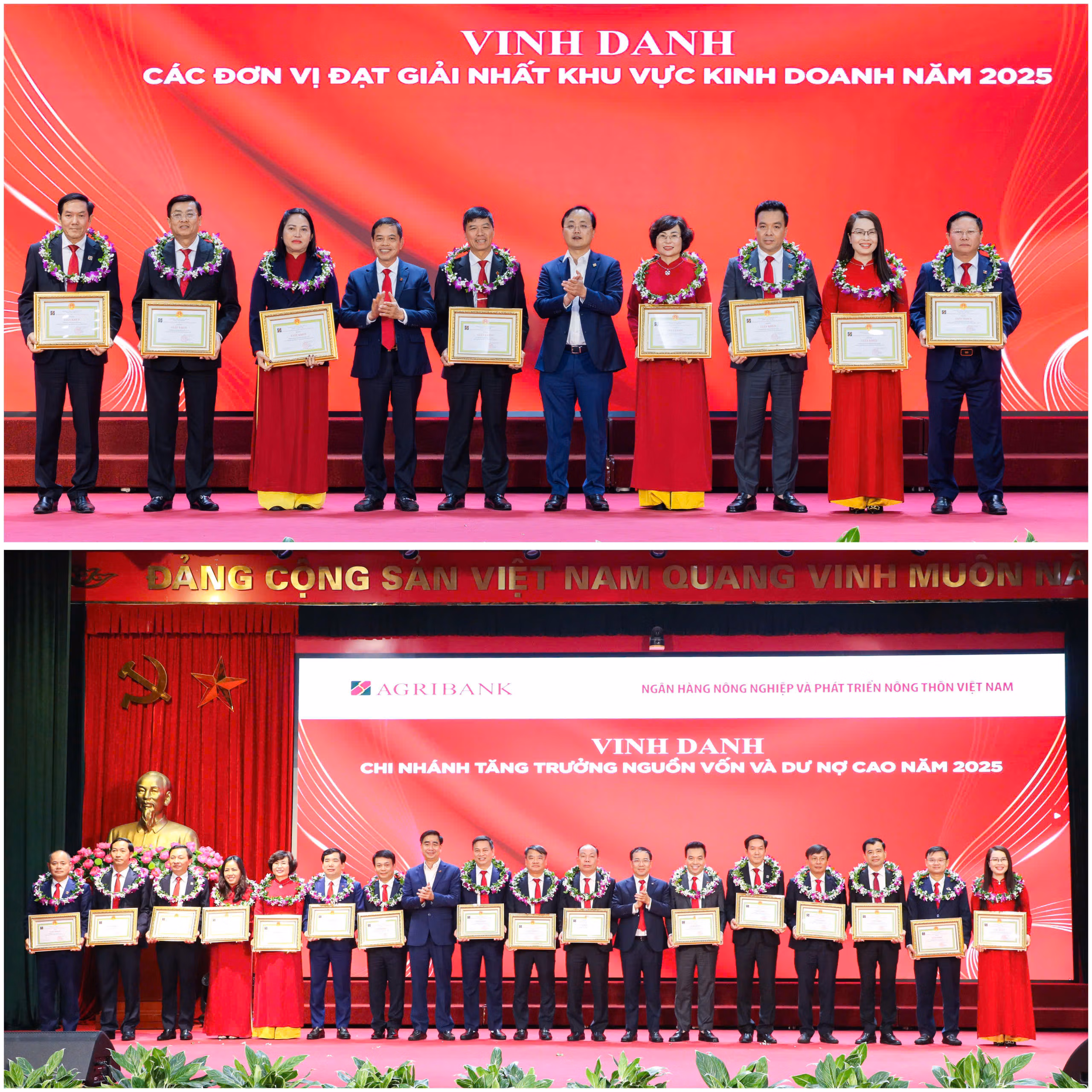 Đồng thời, để kịp thời ghi nhận đóng góp quan trọng của các đơn vị vào kết quả hoàn thành vượt mức các chỉ tiêu kế hoạch kinh doanh năm 2025 của hệ thống, tại Hội nghị, Agribank đã tổ chức trao thưởng, vinh danh các đơn vị xuất sắc, tiêu biểu đạt Giải Nhất, Nhì, Ba toàn hệ thống; các chi nhánh có quy mô tài chính cao, kết quả tăng trưởng nổi bật về nguồn vốn, tín dụng; các chi nhánh có kết quả hoạt động hiệu quả, thu hồi nợ sau xử lý cao; đồng thời biểu dương các tập thể tại Trụ sở chính có thành tích đặc biệt xuất sắc trong công tác tham mưu, điều hành, góp phần quan trọng vào việc hoàn thành các mục tiêu, nhiệm vụ kinh doanh chung của Agribank.