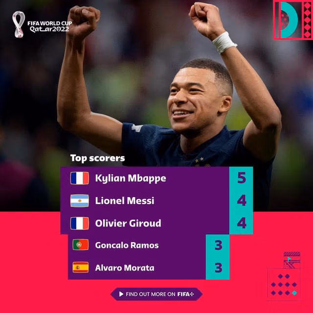 Mbappe đang dẫn đầu danh sách ghi bàn với 5 pha lập công trong khi Messi và Giroud bám sát ngay phía sau với 4 bàn thắng đã được ghi tại World Cup 2022 này.