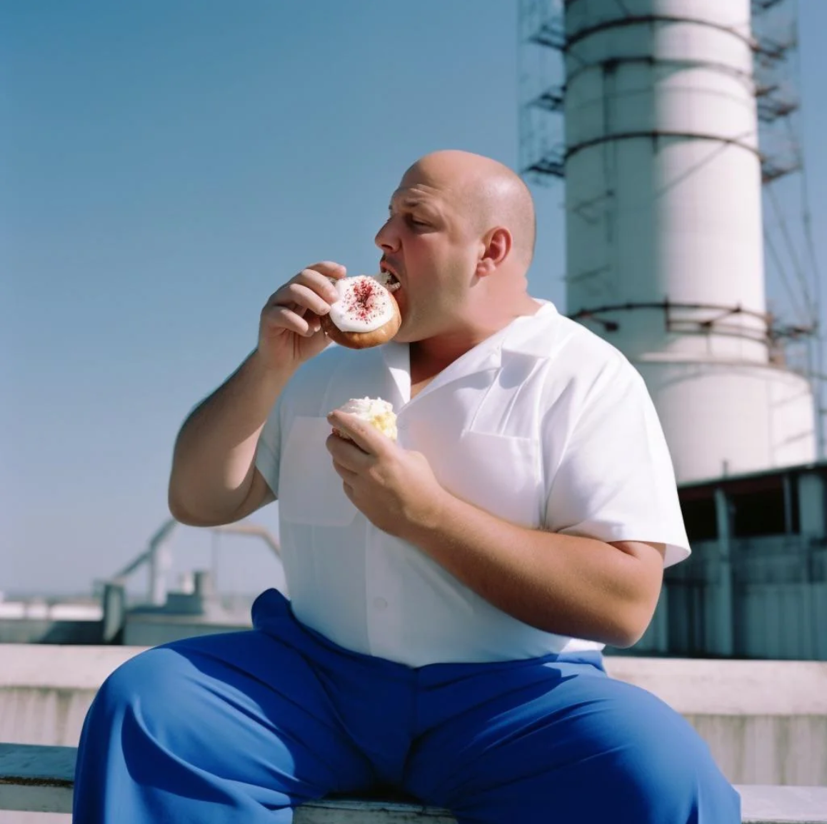 Homer được thấy đang ngồi bên ngoài một nhà máy ăn bánh rán, giống như nhân vật hoạt hình đáng yêu "D'oh" của anh.