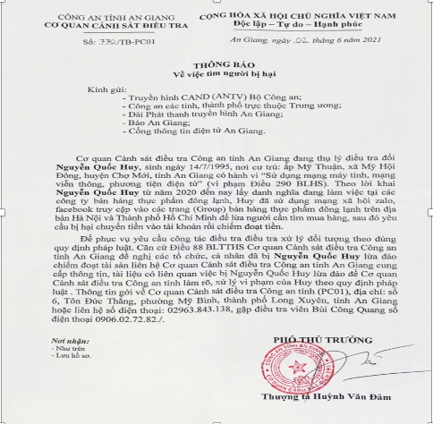 Để phục vụ công tác điều tra, xử lý đối tượng theo đúng quy định pháp luật, Cơ quan CSĐT Công an tỉnh An Giang thông báo tìm các tổ chức, cá nhân đã bị nhóm đối tượng trên lừa đảo, chiếm đoạt tài sản thì cung cấp thông tin, tài liệu có liên quan để cơ quan điều tra làm rõ và xử lý nghiêm hành vi vi phạm pháp luật của nhóm đối tượng này.