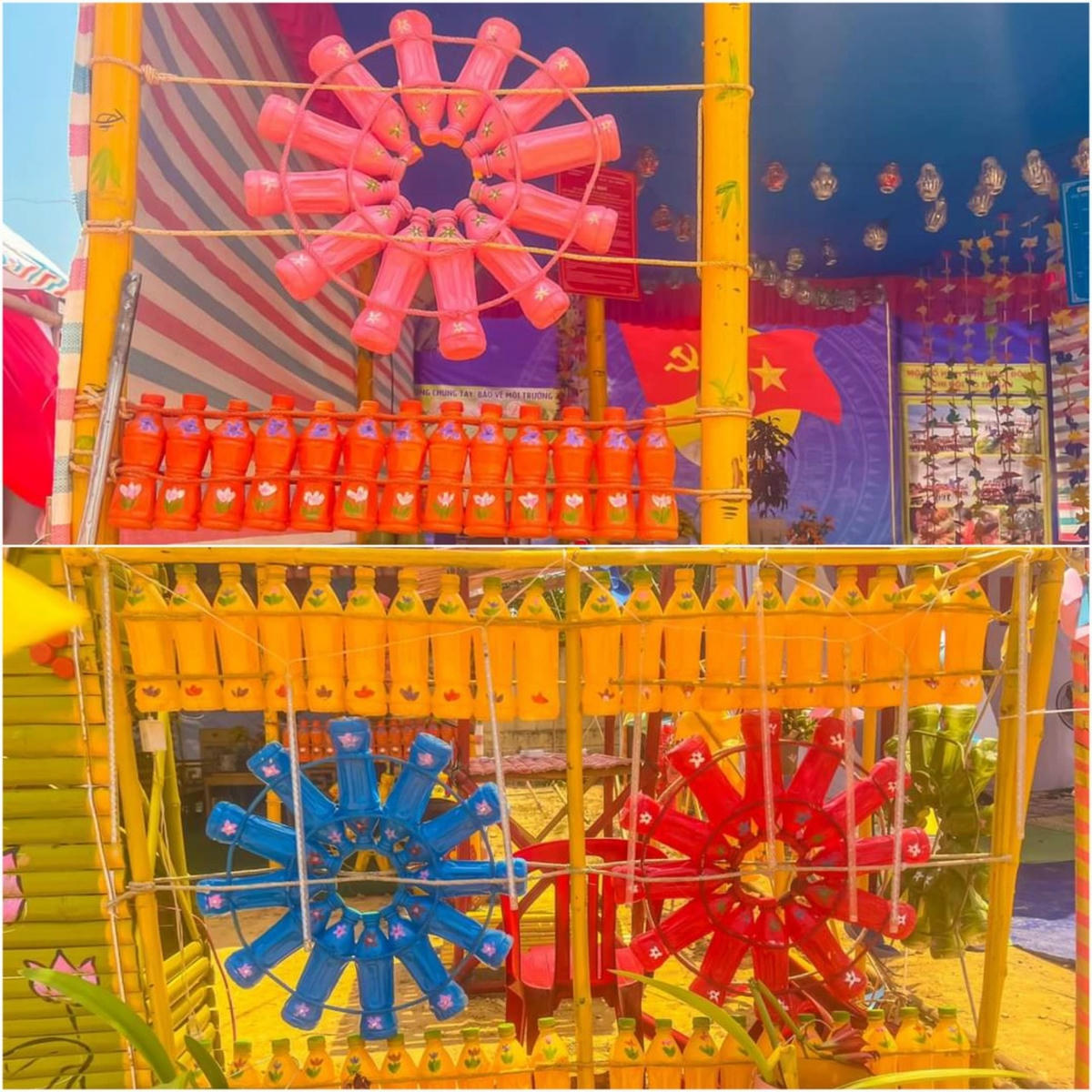 Gian trại được dựng bằng hàng trăm vỏ chai nhựa, vỏ lon, ngư cụ cũ… của cô và trò lớp 9C (Trường THCS và THPT Cửa Việt, huyện Gio Linh, tỉnh Quảng Trị) gây ấn tượng mạnh mẽ với người tham quan.