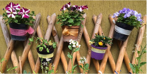 Nếu bạn thực hiện một chút nỗ lực, bạn có thể có một pergola thực sự cho một trong những bức tường. Bạn có thể dùng cọc tre hoặc cọc tre và treo cây lên đó. Chọn bất kỳ lọ hoa nào bạn thích, bao gồm chậu trồng cây dài và chai nhựa nhỏ.