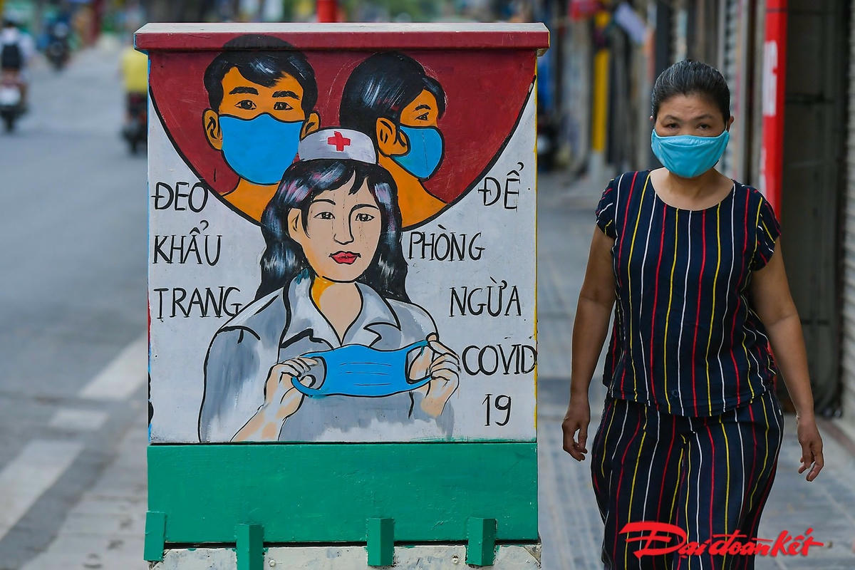 HÌnh ảnh bác sĩ trong bộ đồ bảo hộ được khắc hoạ tỉ mỉ cùng thông điệp: "Chúng tôi đi làm vì mọi người, mọi người hãy ở nhà vì chúng tôi". Ảnh: Quang Vinh. Hình ảnh y bác sĩ cùng thông điệp người dân hãy đeo khẩu trang để phòng ngừa Covid-19. Ảnh: Quang Vinh. Những hình ảnh đầy màu sắc, ý nghĩa nhận được sự chú ý của rất nhiều người dân. Ảnh: Quang Vinh. Những bốt điện được khoác lên mình hình ảnh mới làm đường phố trở nên sạch đẹp và mang nhiều ý nghĩa tích cực trong công tác phòng, chống dịch Covid-19. Ảnh: Quang Vinh. Ngoài các bức hình cổ động tuyên truyền về phòng chống dịch Covid-19, các bốt điện cũng được khoác lên mình những bức tranh rất đẹp, lãng mạn tạo nên một không gian đầy sắc màu tại khu phố này. Ảnh: Quang Vinh.