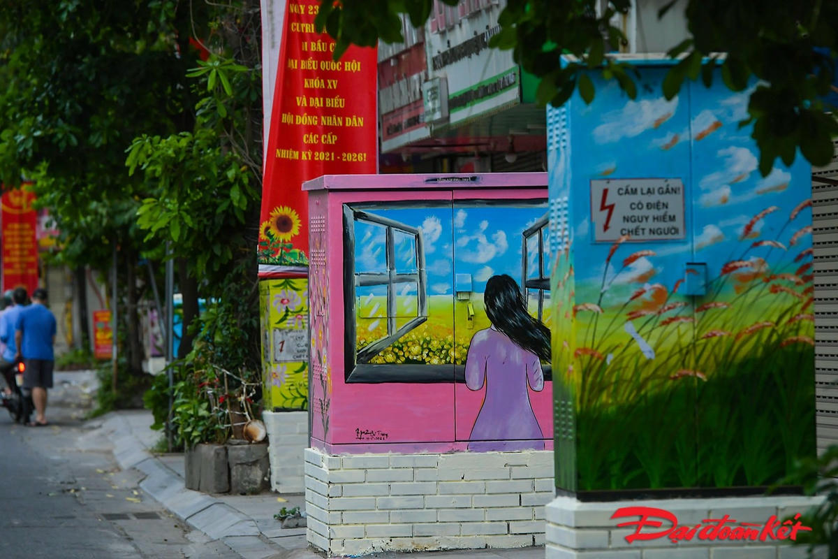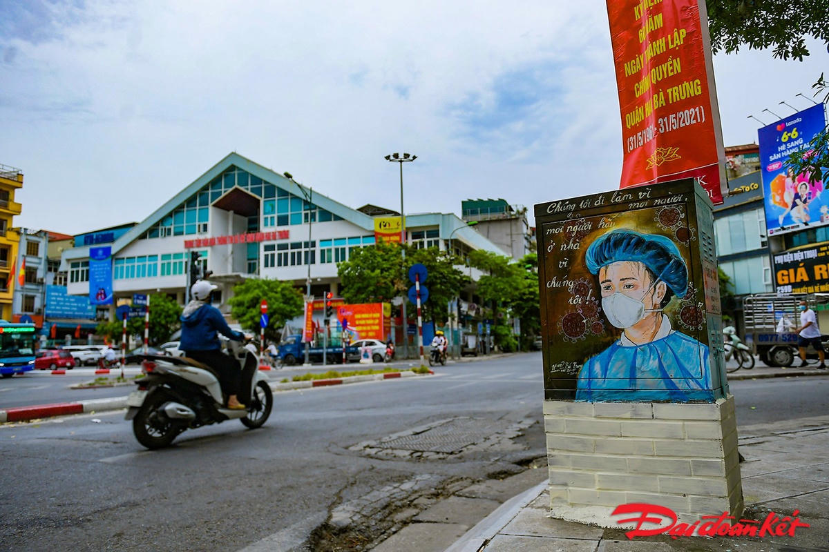 Những bốt điện ở khu vực ngã tư Bạch Mai - Lê Thanh Nghị (quận Hai Bà Trưng) được khoác lên mình những bức tranh cổ động về đội ngũ y bác sĩ. Nhiều người dân bày tỏ sự thích thú, ấn tượng với những hình ảnh này.