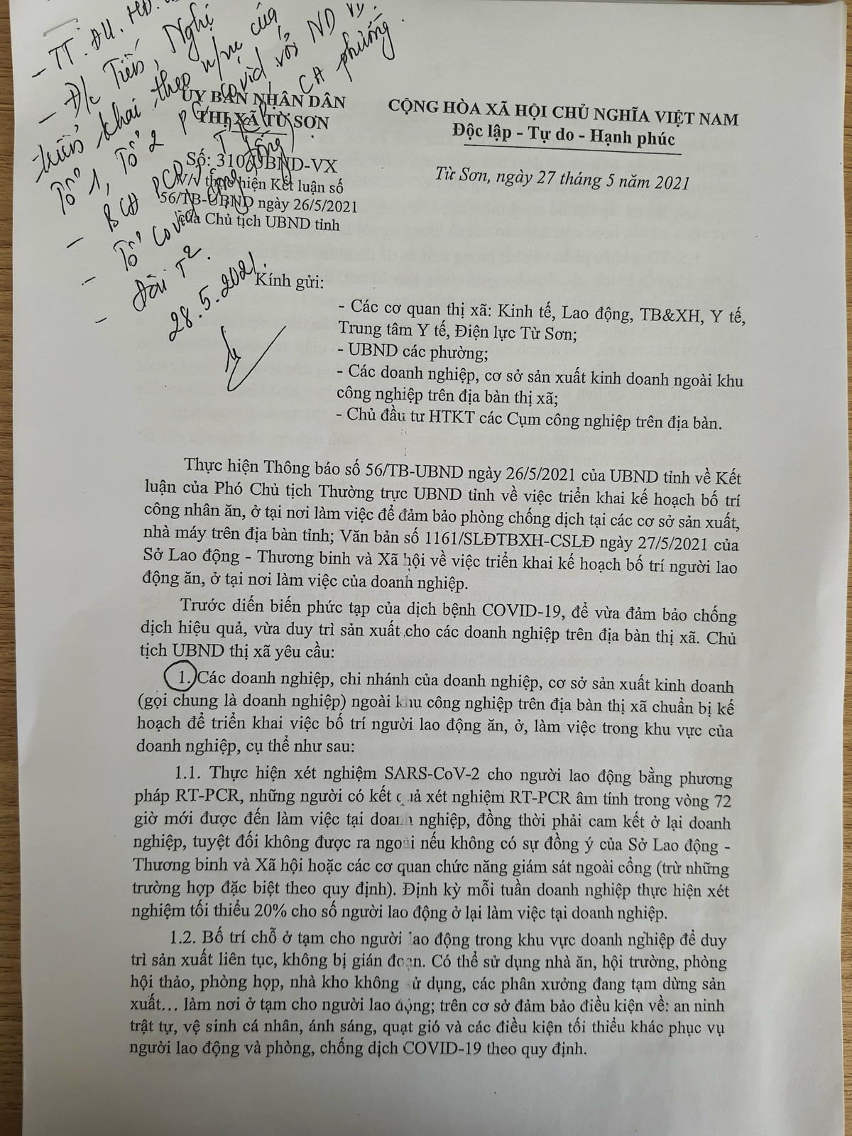 Để từng bước khôi phục hoạt động và đảm bảo chống dịch hiệu quả, Chủ tịch UBND tỉnh Bắc Ninh đã ra thông báo yêu cầu các doanh nghiệp phải chuẩn bị chỗ ăn, ở để công nhân ở lại nhà máy làm việc nhằm phòng chống Covid-19. Việc này bắt đầu thực hiện từ 0h ngày 2/6.