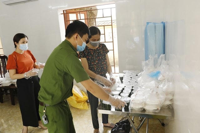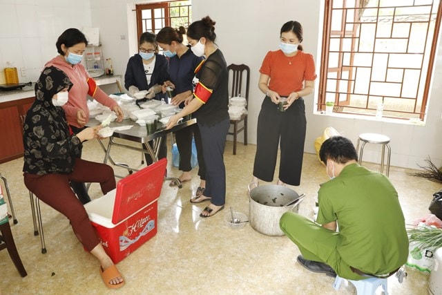Đội 'hậu cần' - Hội phụ nữ xã Tô Hiệu tự nấu ăn và phát tận tay các nhân viên y tế, chiến sĩ công an làm nhiệm vụ tại các chốt trực. Ảnh: Quang Vinh.