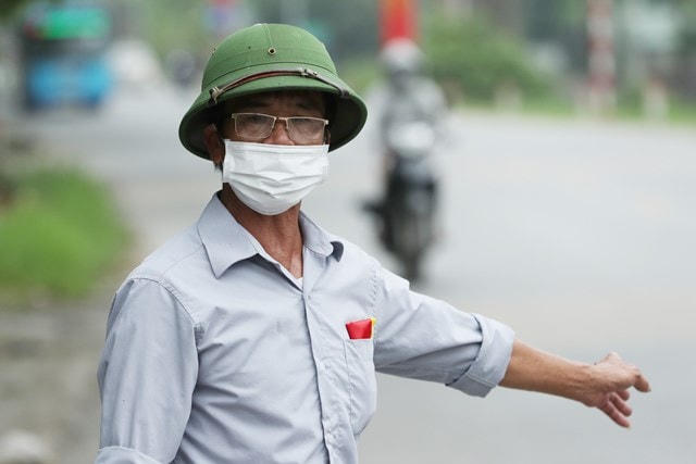 Ông Hoàn Quốc Tuấn - thành viên tổ Covid cộng đồng phố chợ Tía tham gia kiểm tra, hướng dẫn người dân tại chốt kiểm soát. Ảnh: Quang Vinh.