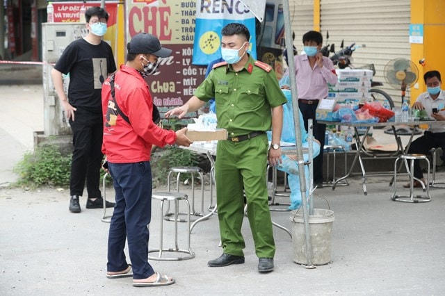 Lực lượng chức năng giải thích về việc giao nhận đồ cho người dân. Ảnh: Quang Vinh.