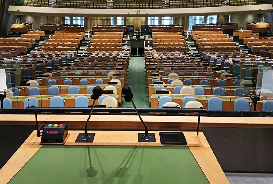 Các hội trường của trụ sở LHQ ở New York đều vắng hoe trong ngay tại thời điểm diễn ra một trong những sự kiện chính trị lớn nhất trong năm - Kỷ niệm 75 năm thành lập Đại hội đồng LHQ (UNGA).