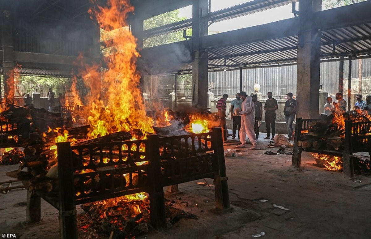 Trong lúc đó, các lò hỏa thiêu ở Ấn Độ phải hoạt động quá công suất để xử lý lượng lớn thi thể bệnh nhân Covid-19 được đưa tới đây. Các lò thiêu xác ở Ấn Độ phần lớn là ở ngoài trời, nhiều lò mới được dựng lên để đáp ứng nhu cầu khẩn cấp.