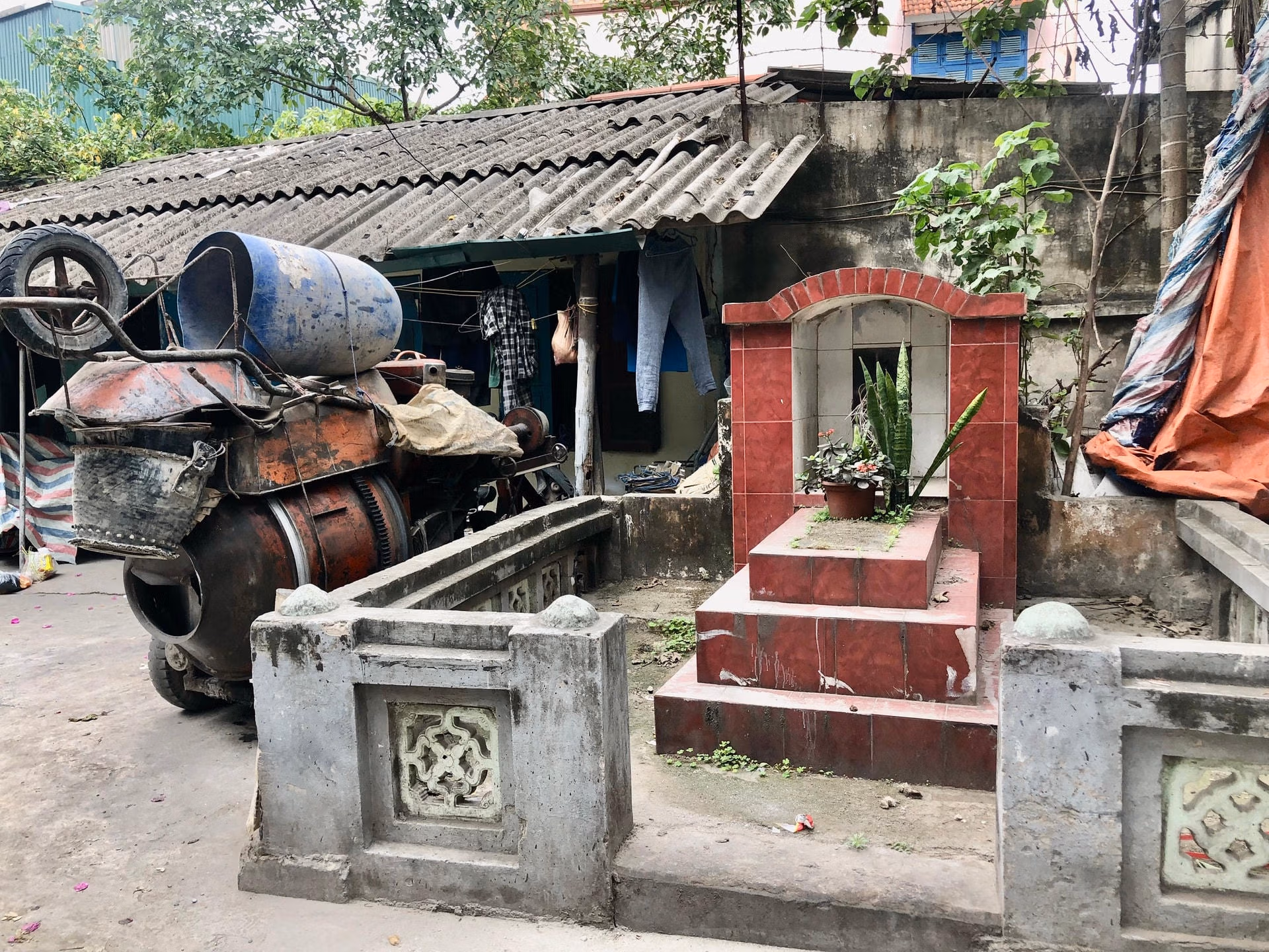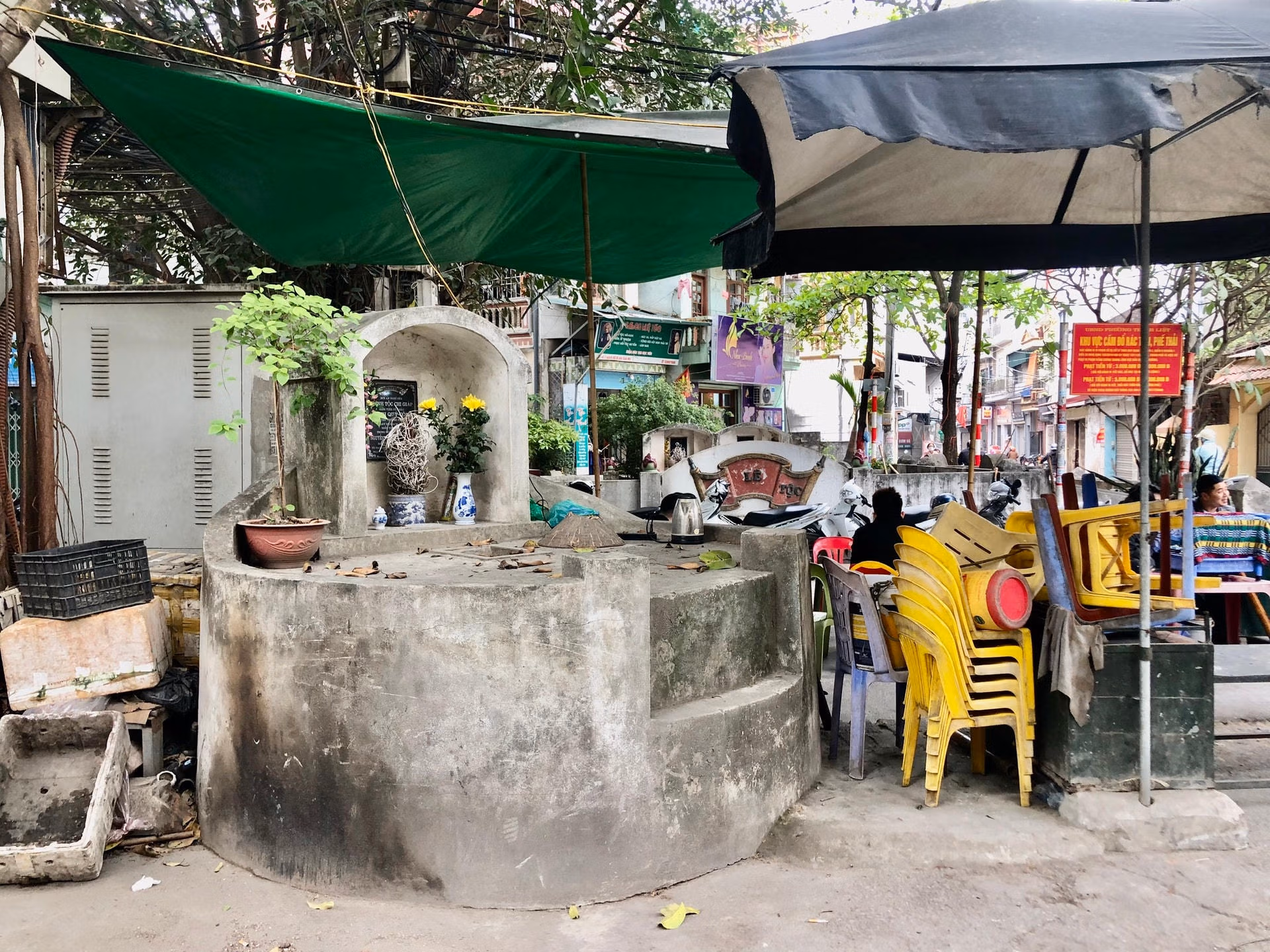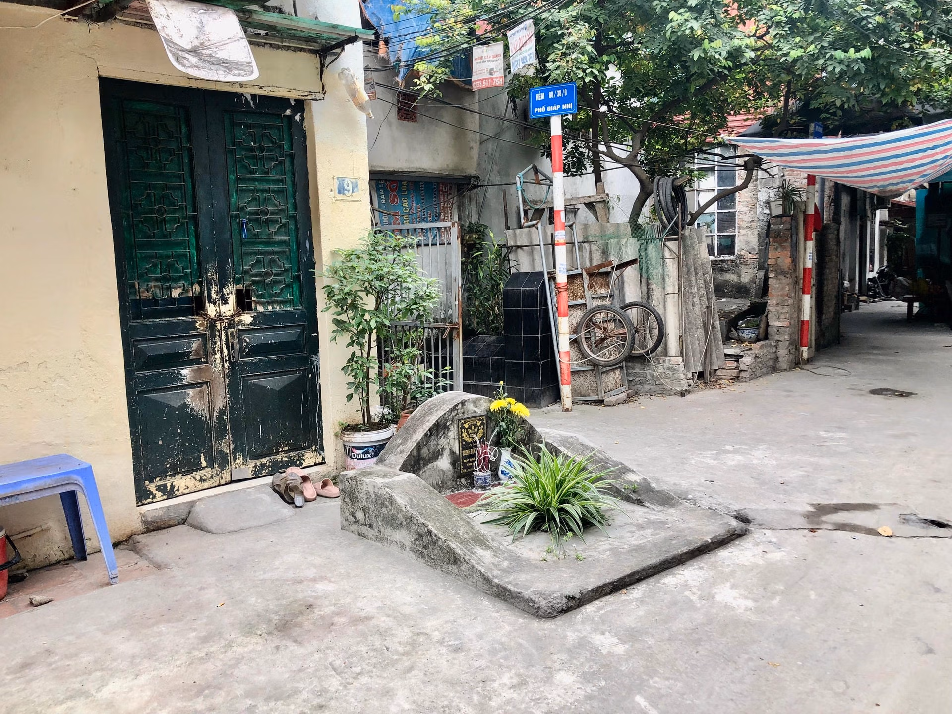 [ẢNH] Hi hữu 'phố nghĩa địa' giữa lòng Hà Nội Thứ Năm 30/03/2023 08:27 (GMT+7) Tại ngõ 88 phố Giáp Nhị (quận Hoàng Mai, Hà Nội), vô số những ngôi mộ nằm xen lẫn với nhà dân, gắn liền với cuộc sống thường nhật của rất nhiều hộ gia đình sinh sống tại đây. Dọc theo ngõ 88 phố Giáp Nhị, không ít ngôi mộ san sát nhau trong diện tích đất sinh hoạt của người dân.Đi sâu dần vào bên trong, rải rác những ngôi mộ nằm ở những vị trí rất "lạ". Thậm chí, khoảng cách tới cửa nhà có thể tính bằng vài bước chân. Một ngôi mộ ngay trước cửa nhà dân.Ngôi mộ nằm ngay mặt tiền của một ngôi nhà 3 tầng. Cổng chính ngôi nhà còn hẹp hơn chiều ngang ngôi mộ.Được biết, những ngôi mộ này thuộc về nhiều dòng họ khác nhau và đã có từ khoảng trăm năm trước.Theo người dân sống lâu năm ở đây, các ngôi mộ đều của các gia đình gốc ở làng Giáp Nhị nên vẫn được hương hoa, dọn dẹp thường xuyên.Theo thời gian, người đông lên, nhà cửa được xây dựng, đất trống không còn, thay thế vào đó là khu phố đông dân cư xây kề với các ngôi mộ.Những ngôi mộ xuất hiện từ rất lâu, người dân cũng không di dời do lo ngại về vấn đề tâm linh.Một quán nhậu kinh doanh ngay bên cạnh 1 ngôi mộ.Người dân nơi đây dường như đã quen với việc sống chung với những ngôi mộ cổ.Theo bà Tâm (65 tuổi, bán nước tại ngõ 88), những ngôi mộ này đã xuất hiện tại đây từ rất lâu. Thanh Bình
