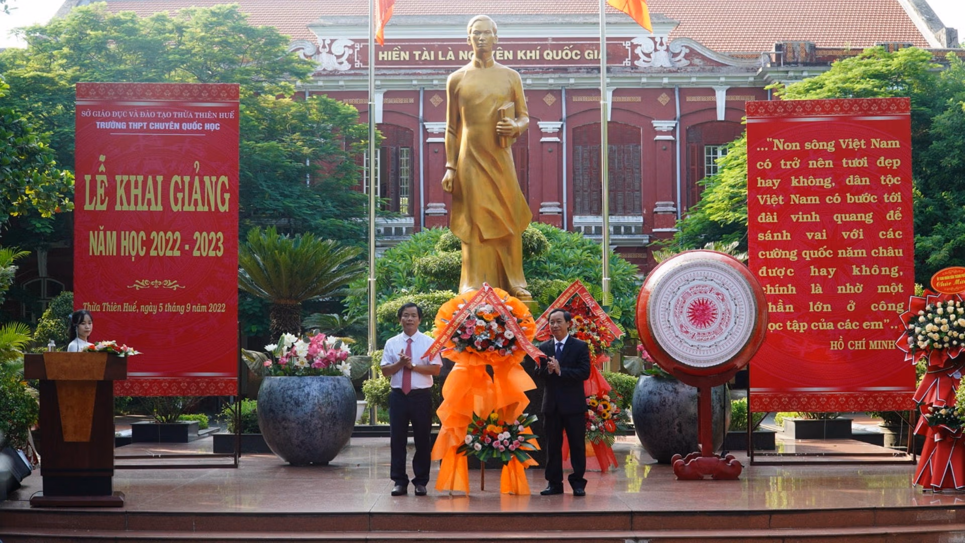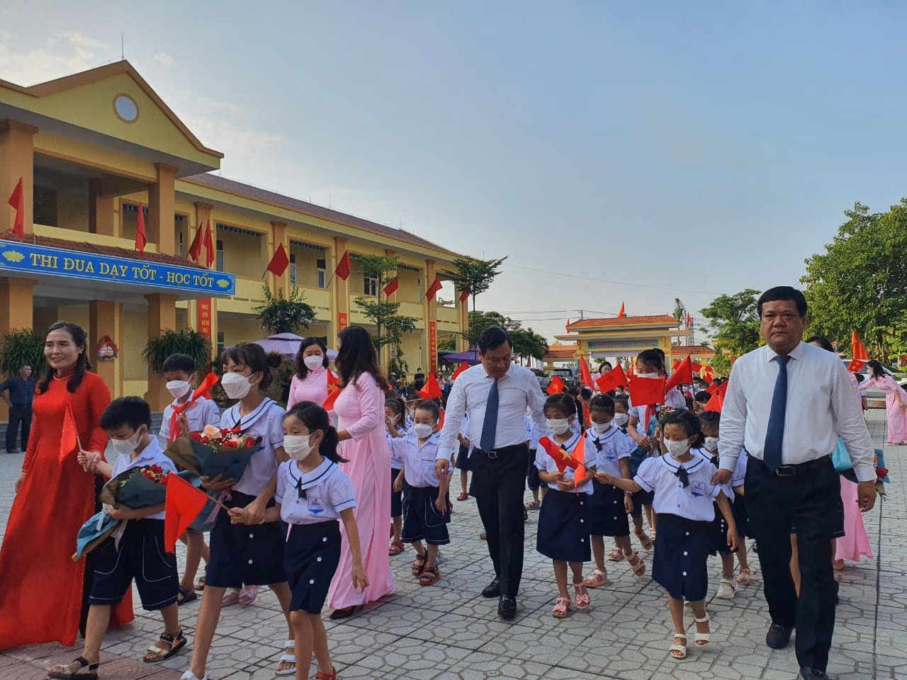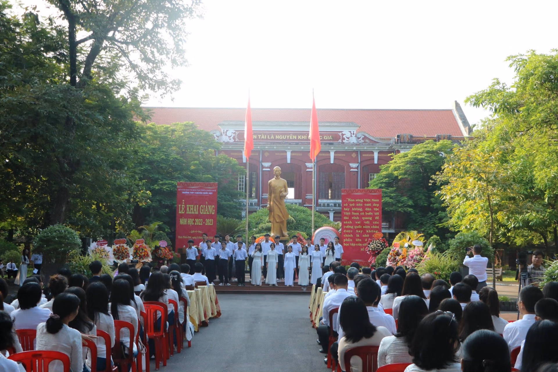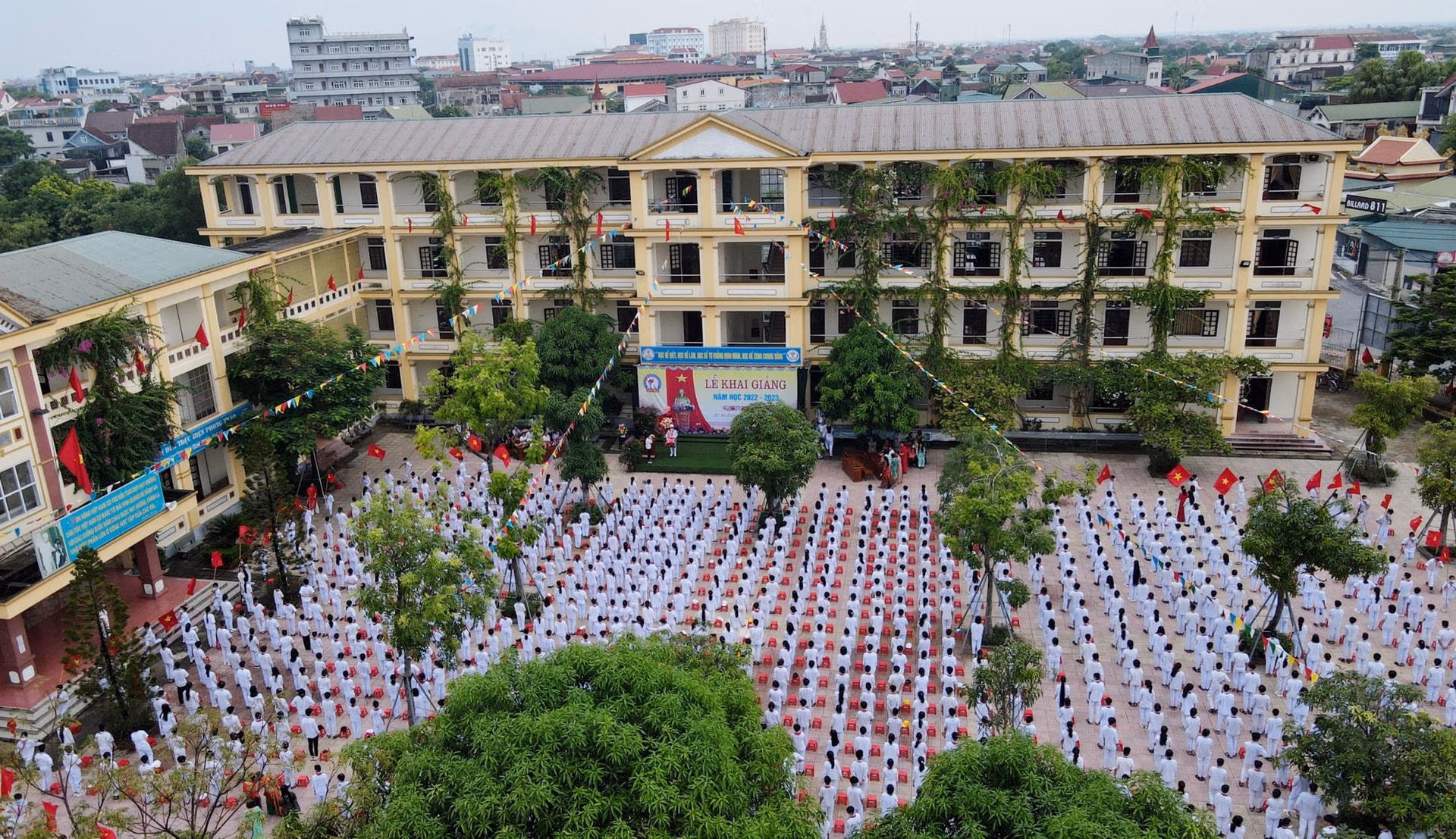 [ẢNH] Học sinh các tỉnh miền Trung nô nức đến trường Thứ Hai 05/09/2022 10:43 (GMT+7) Hoà chung không khí tựu trường của cả nước, sáng 5/9, hàng trăm nghìn học sinh các tỉnh Trung Trung Bộ nô nức đến trường, dự lễ khai giảng năm học mới 2022-2023. Sáng 5/9, khoảng 280.000 học sinh thuộc các cấp học trên địa bàn tỉnh Thừa Thiên - Huế đến trường dự lễ khai giảng năm học mới.Ông Nguyễn Văn Phương, Chủ tịch UBND tỉnh Thừa Thiên - Huế đã đến dự lễ khai giảng và chia vui với thầy cô giáo cùng học sinh trường THPT chuyên Quốc học Huế. Đây là ngôi trường giàu truyền thống trong công tác dạy và học.Năm học 2022-2023, trường THPT chuyên Quốc học Huế đón 420 học sinh khối 10 trúng tuyển vào trường. Những năm qua, trường THPT chuyên Quốc học Huế đã khẳng định tầm vóc, danh tiếng của một ngôi trường giàu truyền thống bậc nhất của xứ Huế.Tại tỉnh Quảng Trị, trong sáng nay các cơ sở giáo dục mầm non, tiểu học, THCS, THPT và giáo dục thường xuyên trên địa bàn tỉnh Quảng Trị tổ chức khai giảng năm học mới 2022 - 2023.Sở Giáo dục và Đào tạo tỉnh Quảng Trị cho biết, trong năm học 2022 - 2023, toàn tỉnh có 399 trường (công lập 378 trường, tư thục 21 trường).Trong năm học 2022-2023, toàn tỉnh Quảng Trị có 170.039 học sinh. Toàn tỉnh hiện có 14.066 cán bộ quản lý, giáo viên, nhân viên.Cùng ngày, ngành giáo dục Quảng Bình đã tổ chức lễ khai giảng năm học mới 2022-2023 với phương châm đổi mới sáng tạo, nâng cao chất lượng giáo dục.Theo Sở Giáo dục và Đào tạo tỉnh Quảng Bình, thời gian qua, ngành giáo dục tỉnh này phối hợp với các sở, ban, ngành tham mưu UBND tỉnh triển khai thực hiện có hiệu quả các chương trình, đề án liên quan thuộc lĩnh vực Giáo dục và đào tạo nhằm tăng trưởng cơ sở vật chất trường học.Ông Đặng Ngọc Tuấn, Giám đốc Sở Giáo dục và Đào tạo tỉnh Quảng Bình cho biết, trong năm học 2022-2023, ngành giáo dục sẽ tiếp tục thực hiện các giải pháp nâng cao chất lượng giáo dục toàn diện, giáo dục mũi nhọn; tăng cường giáo dục đạo đức, lối sống, kỹ năng sống, giáo dục thể chất cho học sinh và đẩy mạnh ứng dụng công nghệ thông tin, thúc đẩy chuyển đổi số… với mục đích nâng cao chất lượng các hoạt động Giáo dục và đào tạo tỉnh nhà trong thời gian tới.Tại Hà Tĩnh, sáng 5/9, hơn 350 ngàn giáo viên và học sinh ở 668 trường học trên địa bàn tỉnh này háo hức đến trường. Lễ khai giảng năm học mới 2022-2023 được tổ chức trong bối cảnh dịch bệnh Covid-19 được kiểm soát, tạo nên một không khí vui tươi, phấn khởi trong ngày hội toàn dân đưa trẻ đến trường.Niềm vui cô trò trường Tiểu học Nam Hà (thành phố Hà Tĩnh) trong ngày lễ khai giảng năm học mới.Các em nhỏ thuộc Trường mầm non 1 (thành phố Hà Tĩnh) hân hoan trong lần đầu tiên dự lễ khai giảng năm học mới. NHÓM PV
