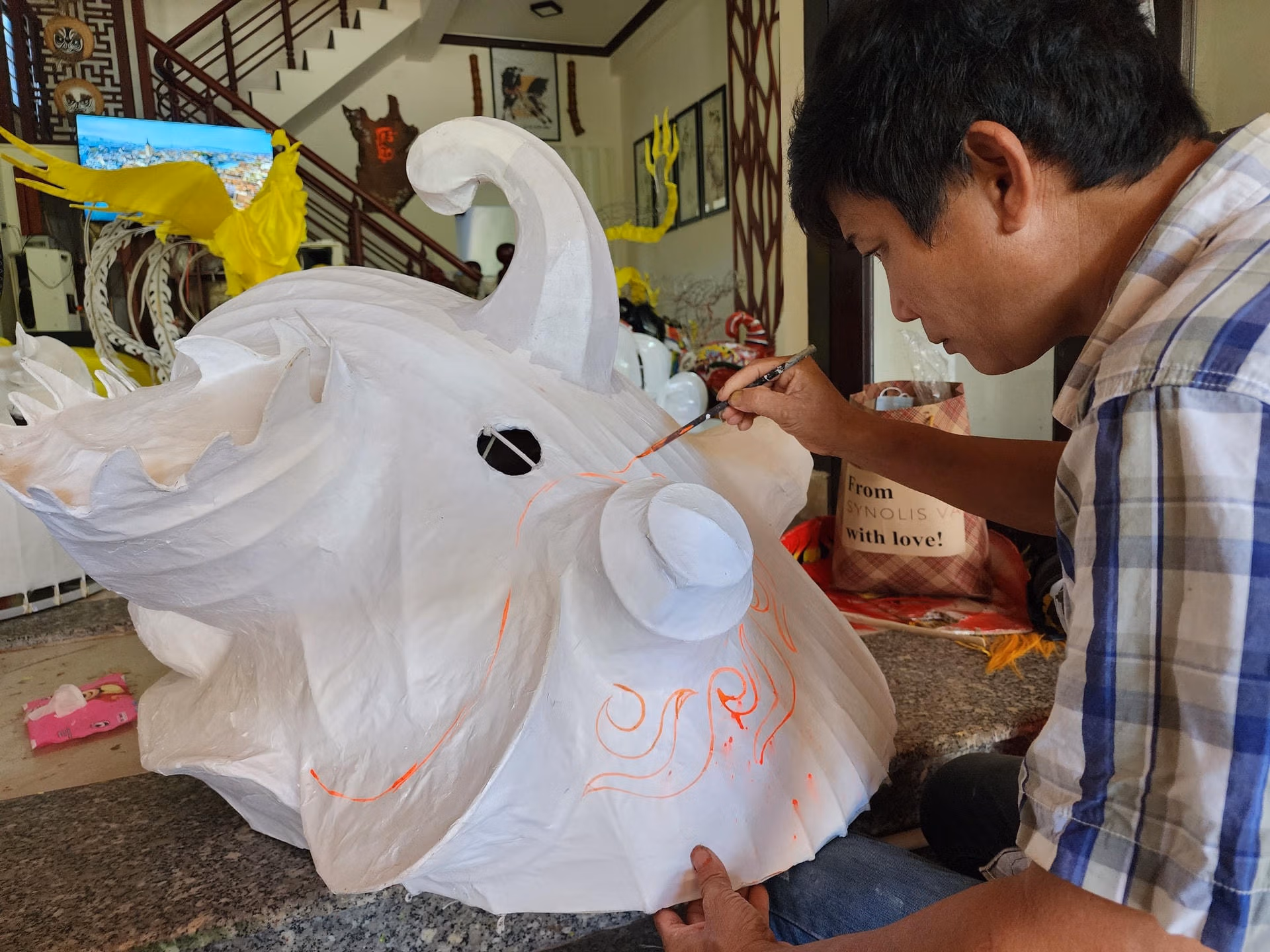 Ông Vàng kể, trước dịch Covid-19, bình quân mỗi năm ông bán hơn 10.000 bộ lân bồi, tức đầu Lân được dán giấy theo khuôn đúc và hơn 100 đầu Lân sườn làm bằng khung mây, tre, chủ yếu bỏ sỉ đại lý Tam Kỳ, Quảng Ngãi, Đà Nẵng... Tùy kiểu dáng, kích thước, phụ kiện đi theo mà giá bán đầu Lân dao động từ vài chục nghìn đồng lên đến vài triệu đồng.