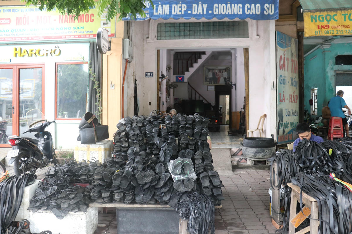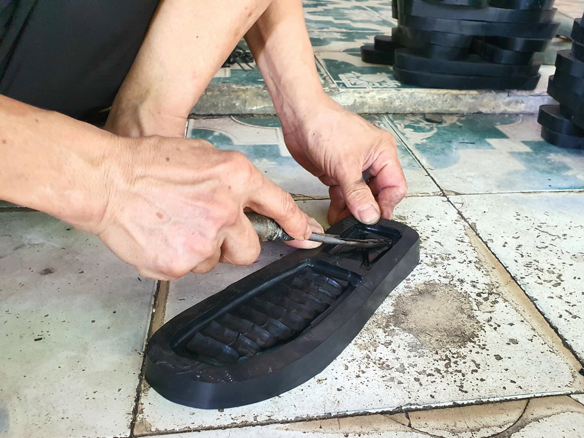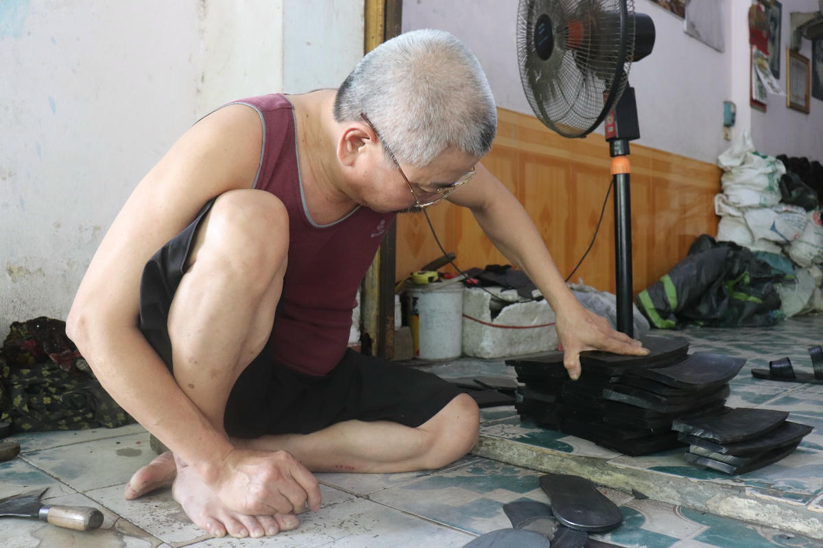 Bước vào ngôi nhà số 187 đường Quang Trung, chúng tôi bắt gặp ông Lê Văn Dung đang cặm cụi, tỉ mỉ cắt gọt tạo từng chi tiết cho chiếc đế dép cao su bên chiếc quạt máy cũ.Dù đã bước qua độ tuổi 60 nhưng ông Dung trông vẫn rất rắn rỏi và khéo léo. Đôi tay ông thoăn thoắt đưa lưỡi dao sắc bén chạy theo những đường bút chì vẽ trước rồi cắt gọt các chi tiết thừa, xẻ các rãnh thoát nước trên tấm cao su tạo thành hình chiếc đế dép. Theo quan sát của chúng tôi, "xưởng" sản xuất của ông Dung cũng chính là phòng khách của gia đình với diện tích khoảng 15 m2. Ngoài bộ bàn ghế cũ, còn lại đều là các nguyên vật liệu, dụng cụ phục vụ cho công việc của ông. Vừa luôn tay làm việc ông Dung vừa kể lại, cách đây hơn nửa thế kỉ, dọc tuyến đường 1A đoạn qua nhà ông trước đây gọi là "tiểu khu Ba Đình", có tới cả chục gia đình chuyên sản xuất dép lốp. Vào thời điểm đó, loại dép này rất được ưa chuộng bởi độ bền, giá rẻ, ma sát tốt lại không ngấm nước. Do đó, công việc sản xuất kinh doanh ở khu phố diễn ra rất sầm uất, nhộn nhịp. Nói về kỹ thuật làm ra đôi dép lốp, ông Dung cho biết, nguyên liệu duy nhất để làm dép là miếng cao su được lấy lại từ phần ngoài của lốp xe tải hạng nặng, chuyên chở than ở vùng mỏ Quảng Ninh mới đảm bảo độ dày và dai chắc cần thiết mà không phải những chiếc lốp ô tô thông thường. .Theo ông Dung, để làm ra một đôi dép hoàn chỉnh, ông mất khoảng 3 giờ đồng hồ. Những đôi dép được làm thủ công các chi tiết nhỏ có thể không đều, tuy nhiên rất chắc chắn, bền đẹp. "Thời điểm cách đây 20 năm, dép lốp được ưa chuộng lắm, mỗi ngày tôi bán hàng trăm đôi dép đi khắp cả nước và xuất bán sang cả Lào, Campuchia… Gia đình tôi lúc đấy phải thuê thêm 4 – 5 thợ làm nữa cũng không đủ hàng giao cho khách", ông Dung cho biết. Tuy nhiên, chỉ được ít năm, sự phát triển của kinh tế xã hội kéo rất nhiều các sản phẩm giày dép đa dạng về chất liệu, mẫu mã khiến cho dép cao su không còn thịnh hành nữa. Có những giai đoạn tưởng chừng cái nghề thủ công này không thể tồn tại nữa.Những cuộn lốp dày mỏng khác nhau cùng chiếc máy cắt đã hoen gỉ được ông xếp gọn ở góc nhà, một số vật dụng như dao, đục, đá mài lại được xếp ngăn nắp trong chiếc thùng gỗ nhỏ.Theo ông Dung, cả tuyến phố hàng trăm người trước đây sống bằng nghề làm dép cao su thì nay chỉ còn duy nhất mình ông gắn bó với nghề. Với ông Dung, giờ đây đôi dép không chỉ đơn thuần mang giá trị kinh tế mà đó còn mang ý nghĩa lịch sử xã hội, là niềm vui những năm tháng tuổi già. "Giờ mấy người đi dép lốp nữa, cả khu phố còn mình tôi giữ được nghề. Nhưng dù thế nào miễn còn sức khỏe, tôi sẽ vẫn còn tiếp tục sống với nghề", ông Dung xúc động nói.Với những dụng cụ tự chế, đôi dép cao su được ông Dung làm thủ công qua nhiều công đoạn như: Pha lốp, cắt lốp thành từng thỏi, tiếp đến là đo theo size để cắt đế, đục lỗ, xâu quai dép… Ông Dung cho biết, làm dép lốp tưởng chừng đơn giản, nhưng để làm được đôi dép đạt đủ các yếu tố bền, êm chân, thẩm mỹ thì không đơn giản. Theo ông, công đoạn khó nhất để tạo nên đôi dép lốp là lên quai dép. Quai dép phải đủ độ cong, trơn nhẵn và ôm chân thì đi mới êm và chắc chân. Do đó, khi làm quai ông liên tục ướm thử vào chân đến khi thấy êm ái, vừa vặn là đạt yêu cầu. Cái hay ở chỗ, giữa quai và đế dép không cần bất cứ một thứ keo kết dính nào mà được cố định chắc chắn vào nhau nhờ vào sự giãn nở của cao su. Hiện tại, mỗi ngày cửa hàng của ông Dung chỉ bán được một vài đôi dép, tùy vào kiểu dáng, kích cỡ như dép trẻ em ông bán với giá 20.000 - 50.000 đồng/đôi còn dép người lớn có giá từ 100.000 - 120.000 đồng/đôi.