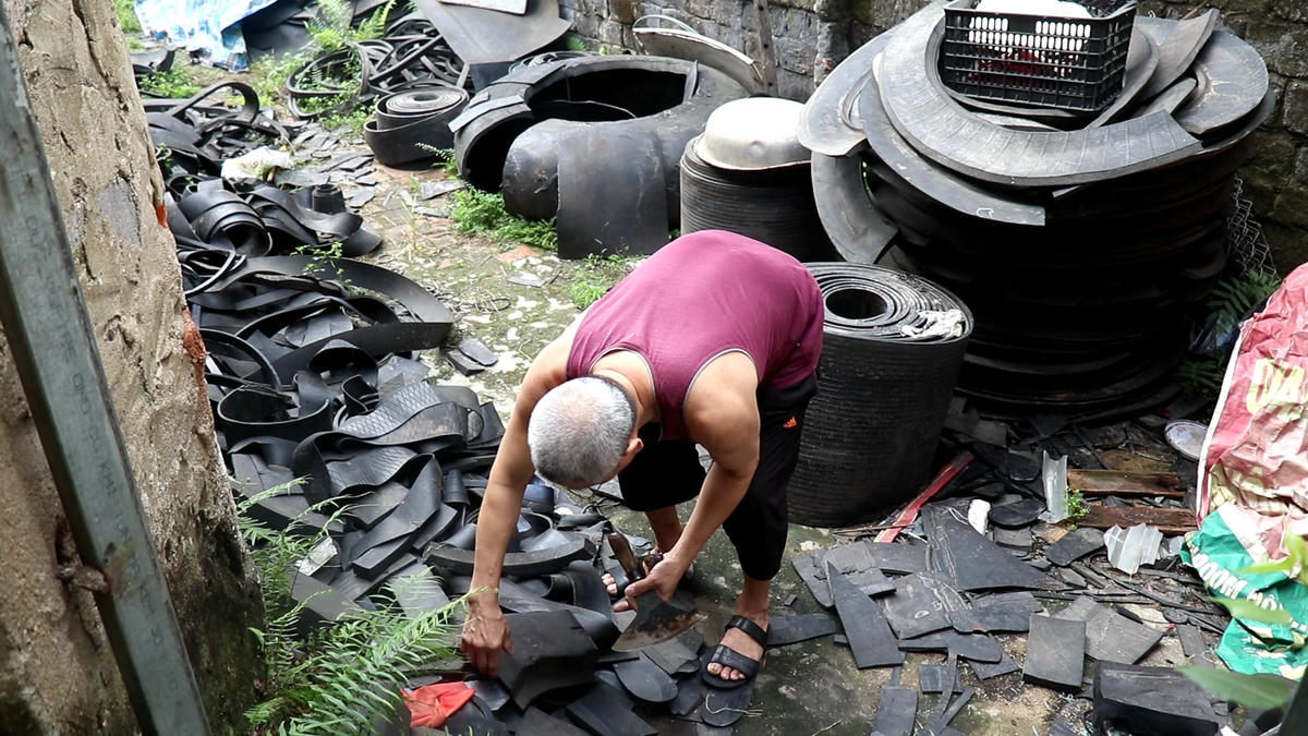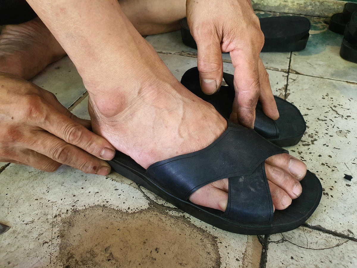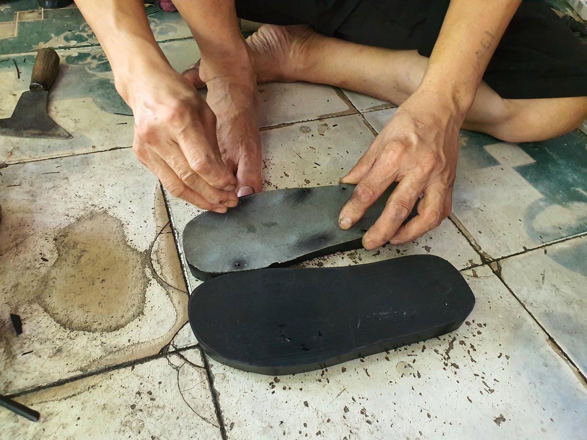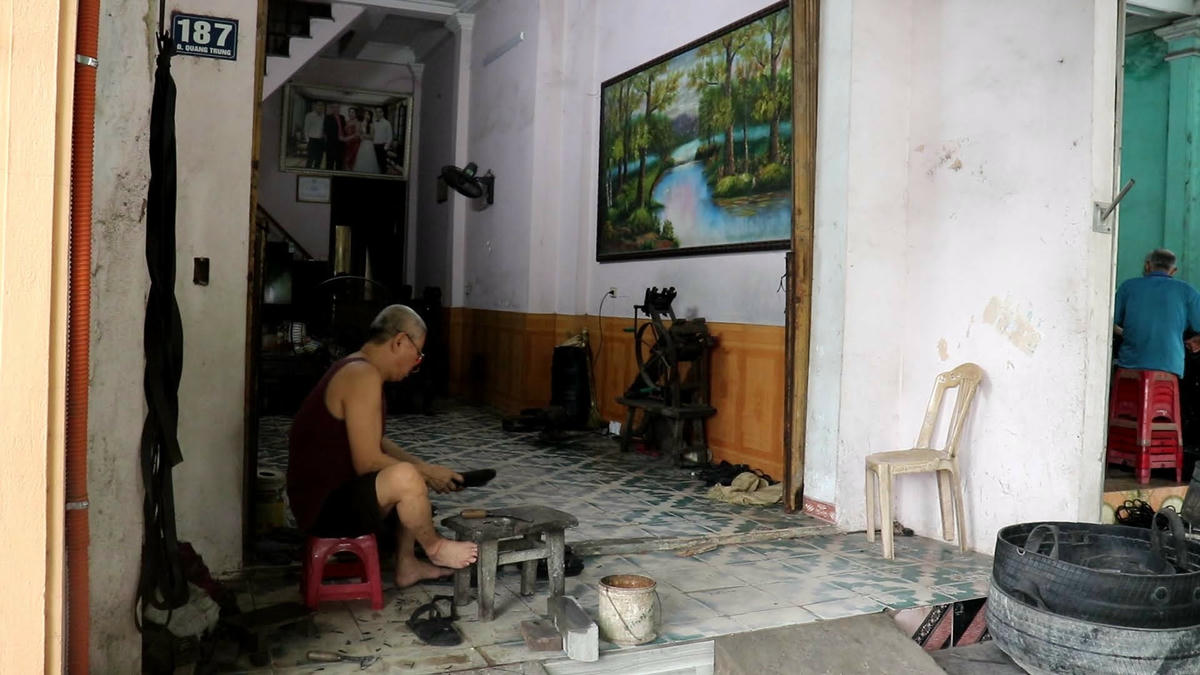 Bước vào ngôi nhà số 187 đường Quang Trung, chúng tôi bắt gặp ông Lê Văn Dung đang cặm cụi, tỉ mỉ cắt gọt tạo từng chi tiết cho chiếc đế dép cao su bên chiếc quạt máy cũ.Dù đã bước qua độ tuổi 60 nhưng ông Dung trông vẫn rất rắn rỏi và khéo léo. Đôi tay ông thoăn thoắt đưa lưỡi dao sắc bén chạy theo những đường bút chì vẽ trước rồi cắt gọt các chi tiết thừa, xẻ các rãnh thoát nước trên tấm cao su tạo thành hình chiếc đế dép. Theo quan sát của chúng tôi, "xưởng" sản xuất của ông Dung cũng chính là phòng khách của gia đình với diện tích khoảng 15 m2. Ngoài bộ bàn ghế cũ, còn lại đều là các nguyên vật liệu, dụng cụ phục vụ cho công việc của ông. Vừa luôn tay làm việc ông Dung vừa kể lại, cách đây hơn nửa thế kỉ, dọc tuyến đường 1A đoạn qua nhà ông trước đây gọi là "tiểu khu Ba Đình", có tới cả chục gia đình chuyên sản xuất dép lốp. Vào thời điểm đó, loại dép này rất được ưa chuộng bởi độ bền, giá rẻ, ma sát tốt lại không ngấm nước. Do đó, công việc sản xuất kinh doanh ở khu phố diễn ra rất sầm uất, nhộn nhịp. Nói về kỹ thuật làm ra đôi dép lốp, ông Dung cho biết, nguyên liệu duy nhất để làm dép là miếng cao su được lấy lại từ phần ngoài của lốp xe tải hạng nặng, chuyên chở than ở vùng mỏ Quảng Ninh mới đảm bảo độ dày và dai chắc cần thiết mà không phải những chiếc lốp ô tô thông thường. .Theo ông Dung, để làm ra một đôi dép hoàn chỉnh, ông mất khoảng 3 giờ đồng hồ. Những đôi dép được làm thủ công các chi tiết nhỏ có thể không đều, tuy nhiên rất chắc chắn, bền đẹp. "Thời điểm cách đây 20 năm, dép lốp được ưa chuộng lắm, mỗi ngày tôi bán hàng trăm đôi dép đi khắp cả nước và xuất bán sang cả Lào, Campuchia… Gia đình tôi lúc đấy phải thuê thêm 4 – 5 thợ làm nữa cũng không đủ hàng giao cho khách", ông Dung cho biết. Tuy nhiên, chỉ được ít năm, sự phát triển của kinh tế xã hội kéo rất nhiều các sản phẩm giày dép đa dạng về chất liệu, mẫu mã khiến cho dép cao su không còn thịnh hành nữa. Có những giai đoạn tưởng chừng cái nghề thủ công này không thể tồn tại nữa.Những cuộn lốp dày mỏng khác nhau cùng chiếc máy cắt đã hoen gỉ được ông xếp gọn ở góc nhà, một số vật dụng như dao, đục, đá mài lại được xếp ngăn nắp trong chiếc thùng gỗ nhỏ.Theo ông Dung, cả tuyến phố hàng trăm người trước đây sống bằng nghề làm dép cao su thì nay chỉ còn duy nhất mình ông gắn bó với nghề. Với ông Dung, giờ đây đôi dép không chỉ đơn thuần mang giá trị kinh tế mà đó còn mang ý nghĩa lịch sử xã hội, là niềm vui những năm tháng tuổi già. "Giờ mấy người đi dép lốp nữa, cả khu phố còn mình tôi giữ được nghề. Nhưng dù thế nào miễn còn sức khỏe, tôi sẽ vẫn còn tiếp tục sống với nghề", ông Dung xúc động nói.Với những dụng cụ tự chế, đôi dép cao su được ông Dung làm thủ công qua nhiều công đoạn như: Pha lốp, cắt lốp thành từng thỏi, tiếp đến là đo theo size để cắt đế, đục lỗ, xâu quai dép… Ông Dung cho biết, làm dép lốp tưởng chừng đơn giản, nhưng để làm được đôi dép đạt đủ các yếu tố bền, êm chân, thẩm mỹ thì không đơn giản. Theo ông, công đoạn khó nhất để tạo nên đôi dép lốp là lên quai dép. Quai dép phải đủ độ cong, trơn nhẵn và ôm chân thì đi mới êm và chắc chân. Do đó, khi làm quai ông liên tục ướm thử vào chân đến khi thấy êm ái, vừa vặn là đạt yêu cầu. Cái hay ở chỗ, giữa quai và đế dép không cần bất cứ một thứ keo kết dính nào mà được cố định chắc chắn vào nhau nhờ vào sự giãn nở của cao su. Hiện tại, mỗi ngày cửa hàng của ông Dung chỉ bán được một vài đôi dép, tùy vào kiểu dáng, kích cỡ như dép trẻ em ông bán với giá 20.000 - 50.000 đồng/đôi còn dép người lớn có giá từ 100.000 - 120.000 đồng/đôi.