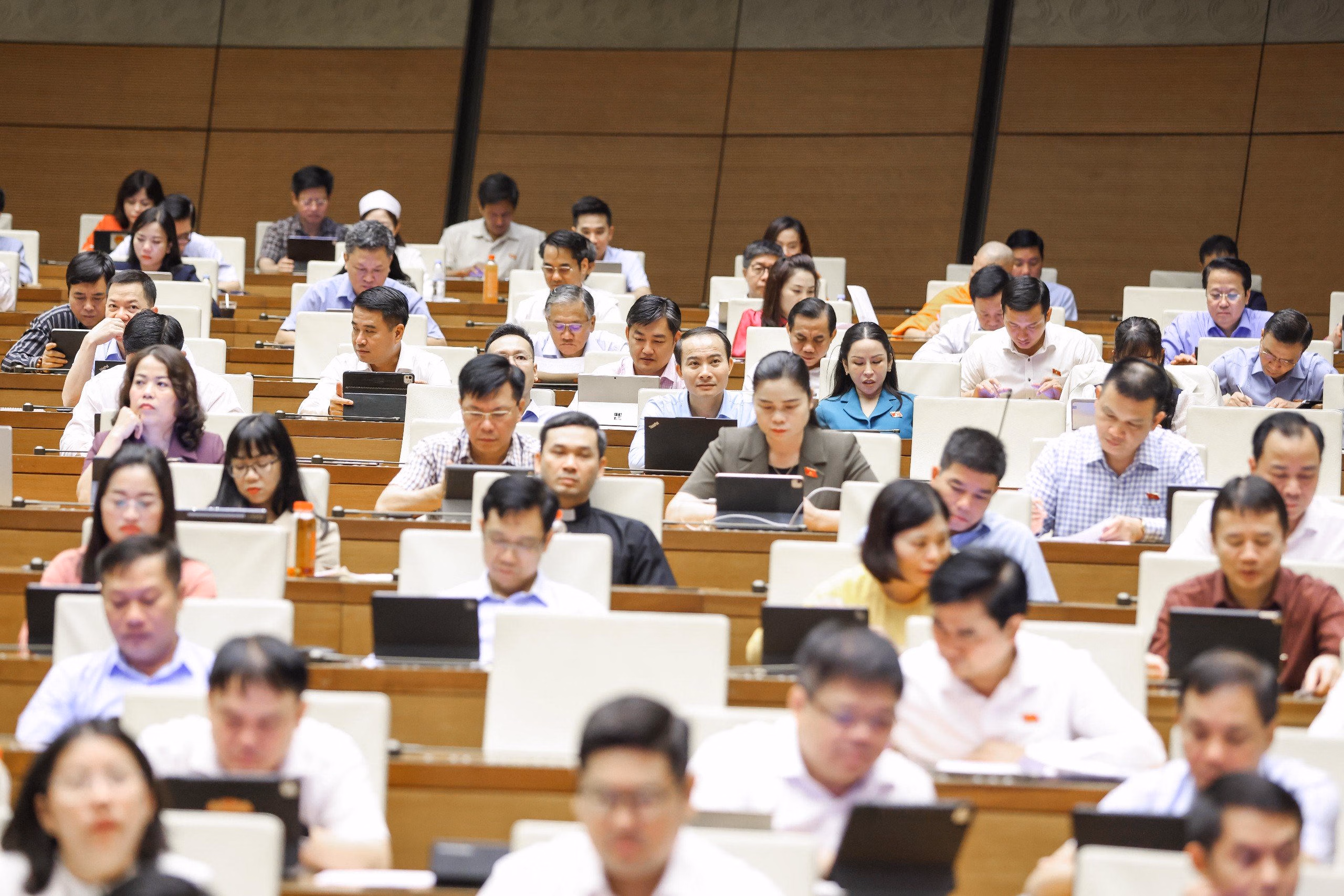 Đầu giờ sáng, Quốc hội thảo luận ở hội trường về dự thảo Nghị quyết của Quốc hội về một số cơ chế, chính sách đột phá phát triển văn hoá Việt Nam.