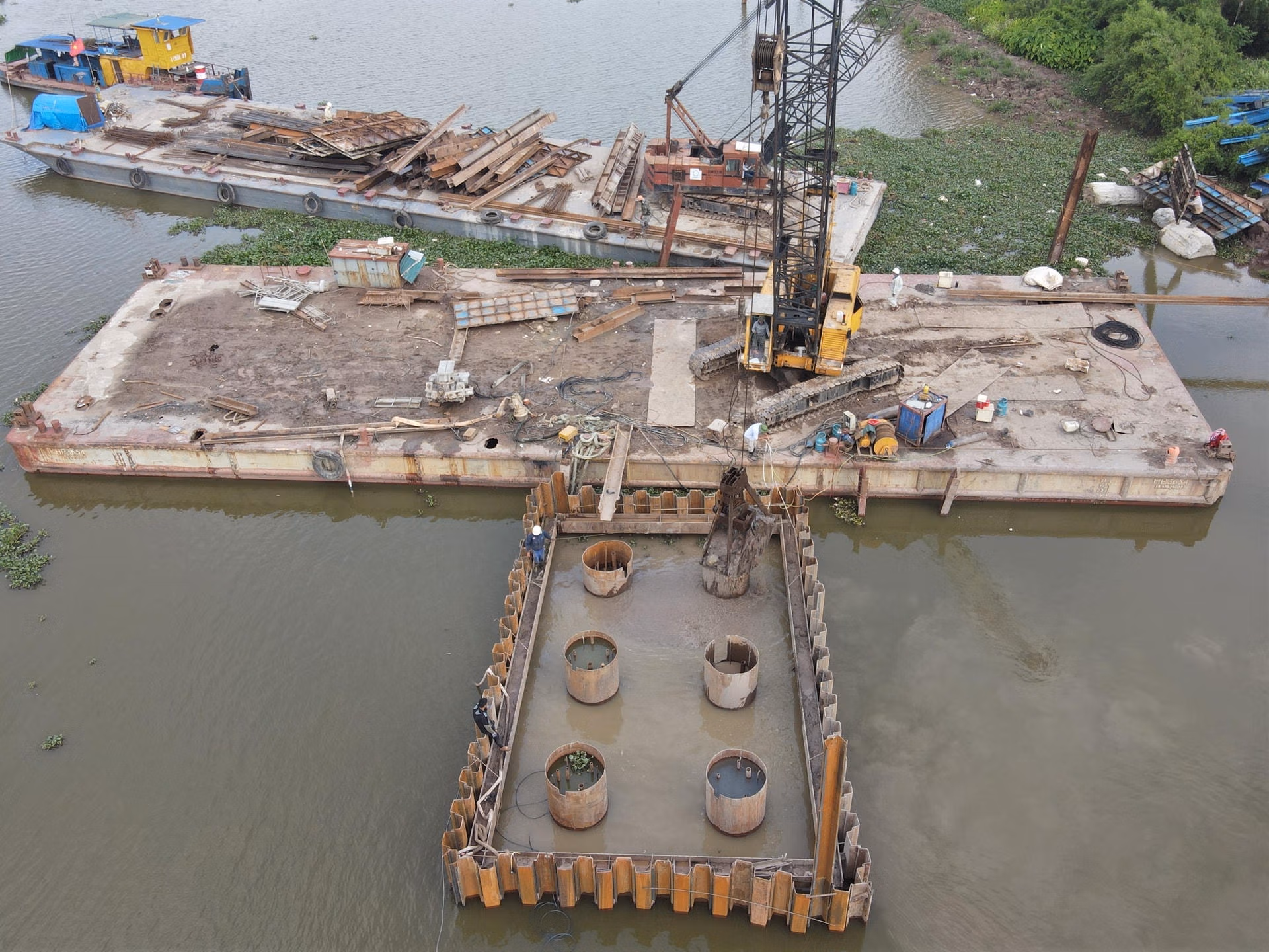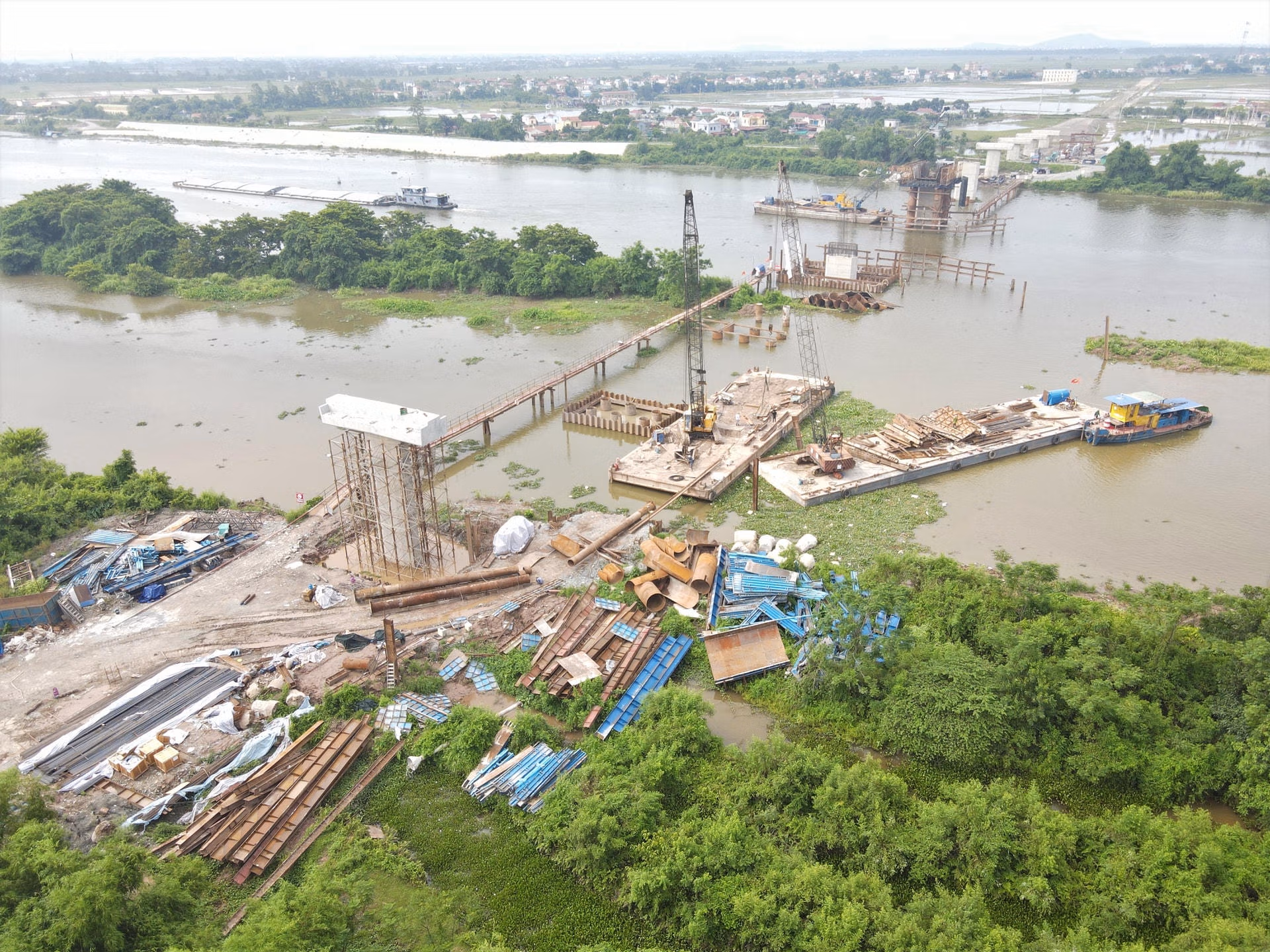 Cầu Bến Mới là công trình nối 2 tỉnh Ninh Bình và Nam Định, được khởi công từ tháng 5/2022 với tổng kinh phí hơn 360 tỷ đồng. Tuy nhiên, sau hơn 1 năm thi công, đến nay, sản lượng xây lắp mới chỉ đạt khoảng 120 tỷ đồng, chiếm 35% giá trị hợp đồng. Thời hạn dự kiến hoàn thành chỉ còn gần 1 năm, trong khi công việc tại đây đang rất ngổn ngang.