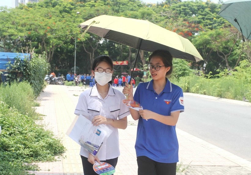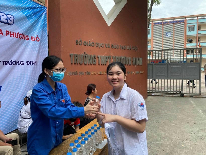 Trưa 10/6, thời tiết Hà Nội khá nắng nóng. Từ 1h chiều, các thí sinh đã có mặt tại điểm thi. Ghi nhận tại điểm thi trường THCS Linh Đàm, lực lượng thanh niên tình nguyện là các em học sinh Trường THPT Việt Nam - Ba Lan đã "đội nắng" trước cổng trường để phát nước, che ô, phát quạt, tiếp sức các sĩ tử "vượt vũ môn".