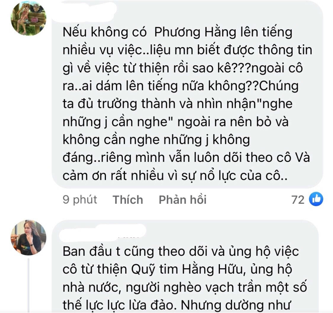 “Luôn tin bà Hằng”; “Bà làm sai thì đã có pháp luật xử lý, nhưng việc bà Hằng bị tạm giam cũng không có nghĩa là tẩy trắng được cho các nghệ sĩ. Nếu không có bà Hằng thì khán giả làm sao biết được tiền từ thiện sẽ đi về đâu, việc tốt ắt sẽ được ghi nhận nên mọi người cũng không nên hùa vào chửi fan người này fan người kia. Công lý rồi cũng sẽ phân minh”; “Tâm của cô Hằng thì tốt vì ít nhất cô đã hướng đến người nghèo. Dù biết lời nói của cô có phần đi hơi xa nhưng vẫn mong rằng kết quả cô sẽ không sao”… là những bình luận từ người hâm mộ xoay quanh thông tin bà Nguyễn Phương Hằng bị bắt.
