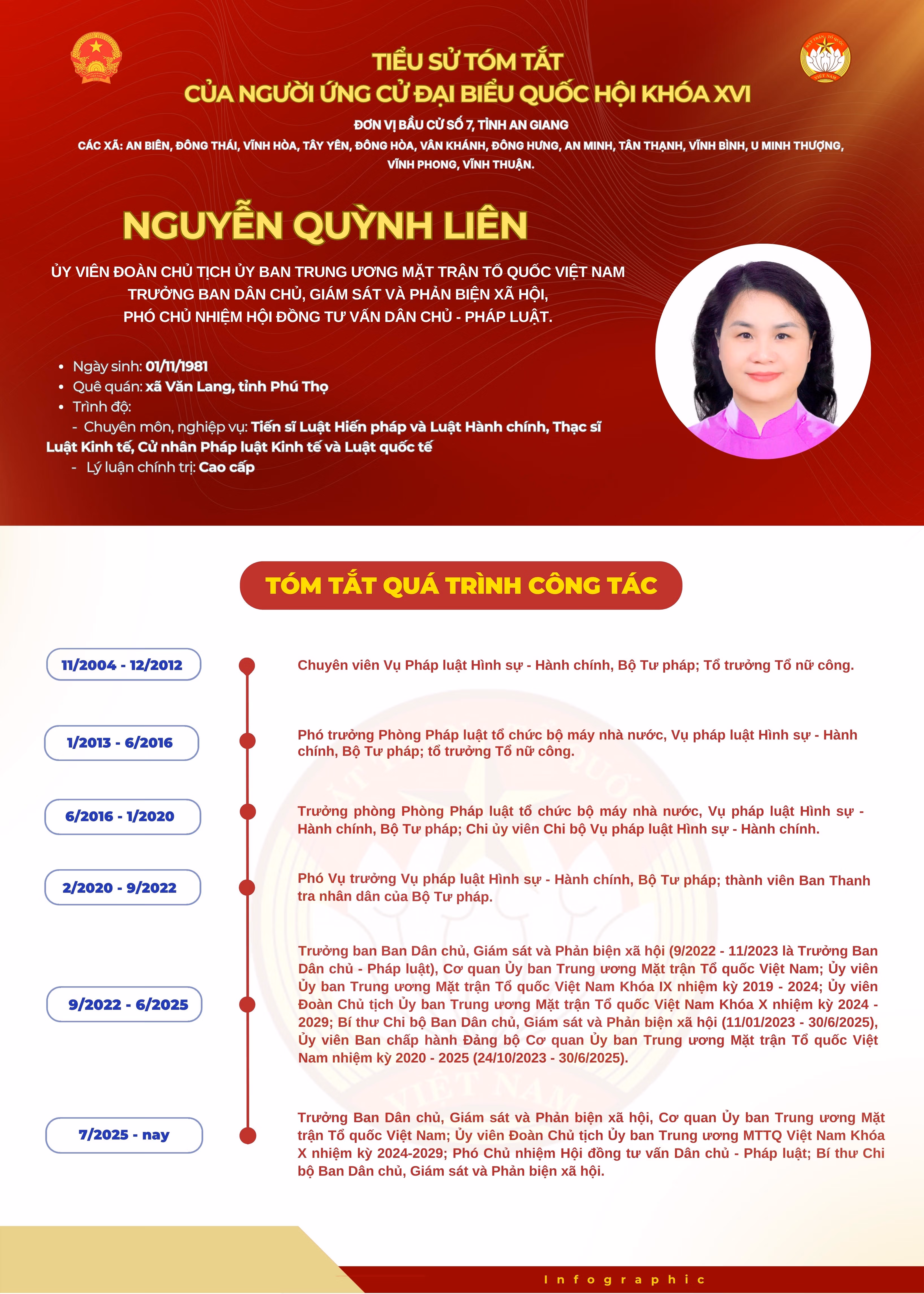 Tại hội nghị, Ban tổ chức đã công bố các thông tin về tiểu sử của 5 ứng cử viên ứng cử Đại biểu Quốc hội khóa XVI, nhiệm kỳ 2026 – 2031, đơn vị bầu cử số 07, tỉnh An Giang (các xã: An Biên, Đông Thái, Vĩnh Hòa, Tây Yên, Đông Hòa, Vân Khánh, Đông Hưng, An Minh, Tân Thạnh, Vĩnh Bình, U Minh Thượng, Vĩnh Phong, Vĩnh Thuận) gồm: ông Nguyễn Mạnh Hùng - Phó Giám đốc Công ty Trách nhiệm hữu hạn một thành viên An Bảo; Ủy viên MTTQ Việt Nam đặc khu Phú Quốc, tỉnh An Giang; đại biểu HĐND đặc khu Phú Quốc nhiệm kỳ 2021 – 2026; bà Nguyễn Ngọc Duy Lam - Phó Trưởng Phòng Nghiệp vụ I, Cơ quan Ủy ban Kiểm tra Tỉnh ủy An Giang; bà Nguyễn Quỳnh Liên - Bí thư Chi bộ, Trưởng Ban Dân chủ, Giám sát và Phản biện xã hội; Ủy viên Đoàn Chủ tịch Uỷ ban TƯ MTTQ Việt Nam; Phó Chủ nhiệm Hội đồng tư vấn Dân chủ - Pháp luật của Ủy ban TƯ MTTQ Việt Nam; bà Huỳnh Kim Minh Tâm - Đảng ủy viên, Phó Bí thư Chi bộ, Trưởng phòng Chỉ đạo tuyến, Bệnh viện Đa khoa Kiên Giang; ông Nguyễn Việt Thắng - Ủy viên Ban Chấp hành Đảng bộ, Phó Chủ nhiệm Thường trực Ủy ban Kiểm tra Tỉnh ủy, kiêm Ủy viên Ban Thường vụ, Chủ nhiệm Ủy ban Kiểm tra Đảng ủy các cơ quan Đảng tỉnh An Giang; Ủy viên Ủy ban Pháp luật và Tư pháp của Quốc hội; Ủy viên Nhóm Nghị sĩ hữu nghị Việt Nam - Iran.