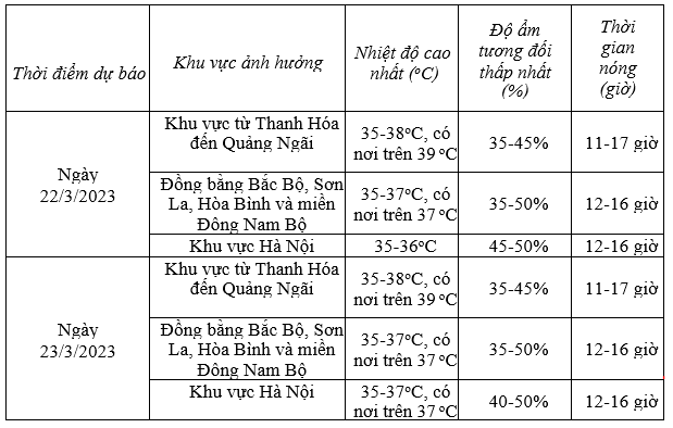 Đặc biệt, từ Thanh Hóa đến Quảng Ngãi có nắng nóng và nắng nóng gay gắt, có nơi đặc biệt gay gắt với nhiệt độ cao nhất 35-38 độ, có nơi trên 39 độ, độ ẩm tương đối thấp nhất 35-50%.