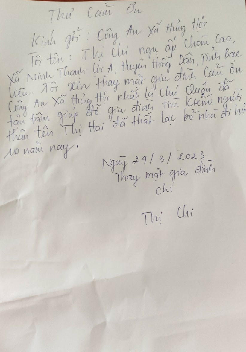 Sau 10 năm thất lạc, trong giây phút đoàn tụ với gia, chị Thị Chi và mọi người rất vui mừng ôm chầm lấy nhau. Để bày tỏ, gia đình đã viết thư cảm ơn Công an xã Hưng Hội nói riêng, Công an tỉnh Bạc Liêu nói chung.