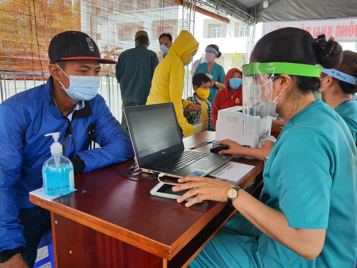 Nhân viên y tế đang hướng dẫn người dân thực hiện khai báo y tế.
