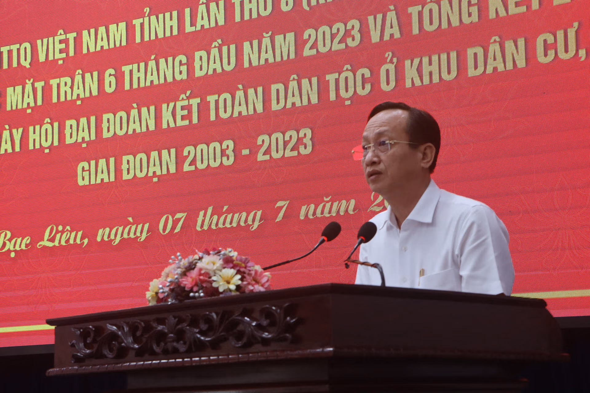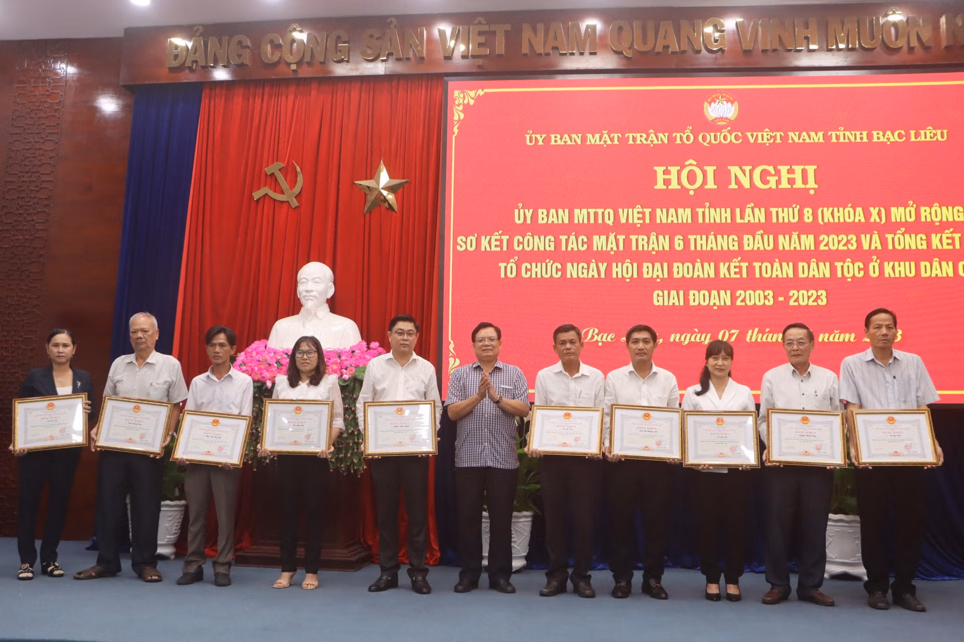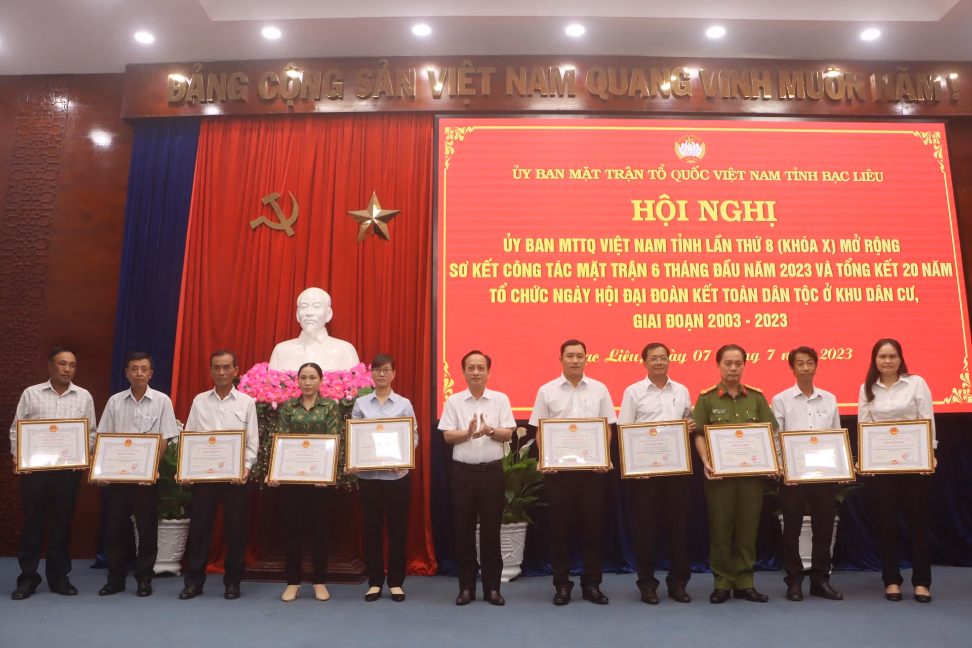 Chiều 7/7, Ủy ban MTTQ Việt Nam tỉnh Bạc Liêu tổ chức Hội nghị lần thứ 8 (khóa X) tổng kết 20 năm tổ chức Ngày hội đại đoàn kết toàn dân tộc ở khu dân cư, giai đoạn 2003 – 2023 và sơ kết đánh giá công tác Mặt trận 6 tháng đầu, triển khai phương hướng nhiệm vụ 6 tháng cuối năm 2023.