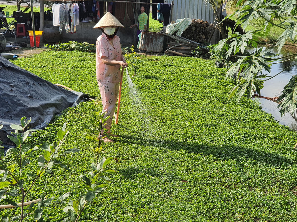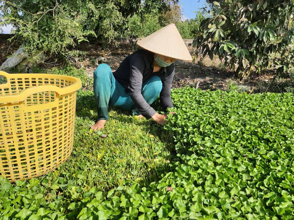 Nông dân xã Vĩnh Thanh tận dụng đất vườn tạp và đất trống quanh nhà để trồng rau má.