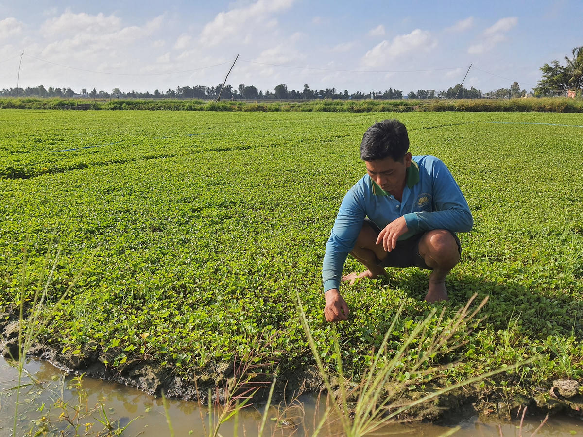 Vườn rau má bạt ngàn xanh mướt của gia đình anh Đặng Văn Triệu ở ấp Huê 2 A, xã Vĩnh Thanh huyện Phước Long nằm cạnh con kênh thủy lợi. Anh Triệu cho hay, mình “bén duyên” với loại cây trồng này cách đây 3 năm. Nhiều năm trước, gia đình chị Triệu là hộ cận nghèo. Hết mùa lúa, vợ chồng chị phải đi làm mướn kiếm thêm thu nhập để trang trải cuộc sống gia đình. Tuy nhiên, nhờ biết tận dụng hơn 4 công đất vườn tạp để đưa vào trồng rau má mà gia đình anh Triệu đã thoát được nghèo và vươn lên khá giàu.