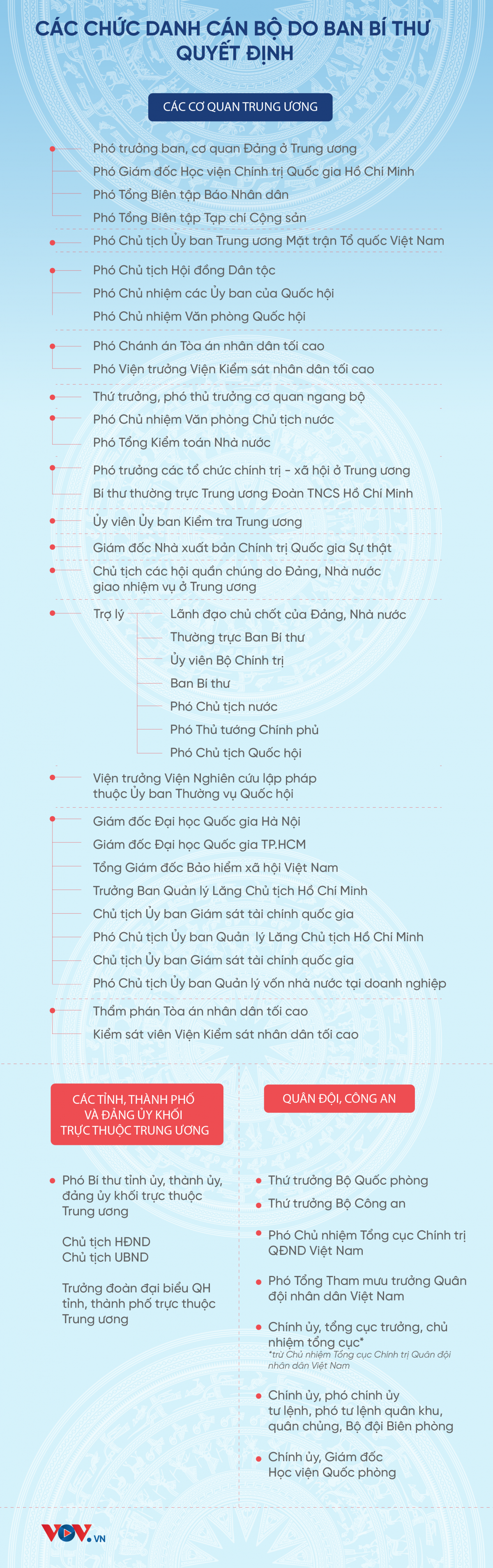 Theo Quy định số 80 được ban hành vào cuối tháng 8/2022, Ban Bí thư sẽ quyết định hơn 20 chức danh cán bộ quan trọng như: Thứ trưởng các bộ ngành, Giám đốc Đại học Quốc gia, trợ lý lãnh đạo Đảng, Nhà nước,...